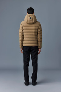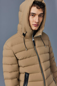 JACK is an AGILE-360 ultra light rcycled down jacket for men featuring an adjustable storm visor hood. Expertly tailored to a regular fit, the 2-way stretch shell offers ease of movement while the elastic trims and drawcord hem enhance the comfortable feel. It is water resistant and repellent, and the centre front zip is accented with edgepainted leather tape. Modern and classic, an effortless staple. - AGILE-360 ultra light down jacket - 100% recycled down - 800 fill power - Moderate Cold: Down to -15°C - 2-way stretch shell - Water resistant and repellent - Hood with adjustable drawcord storm visor - Centre front zip closure - Insulated zip waist pockets with edgepainted leather tape - embossed leather placket - Elastic hem with adjustable drawcord - Elastic cuffs - Signature M logo patch on left sleeve - Regular fit SIZE & FIT - REGULAR – Classic fit allowing comfort and style. - Designed to be worn with heavier layers. - The model is 6'2" (187 cm) and wears a size 40. - Coat length from shoulder to hem: 27'' / 68.58 cm. COMPOSITION & CARE INSTRUCTIONS - Shell: 82% polyamide/nylon, 18% elastane/spandex. Filling: 90% goose down, 10% goose feathers. - Dry clean by leather specialist using oil based solvent only. Do not use perchloroethylene.