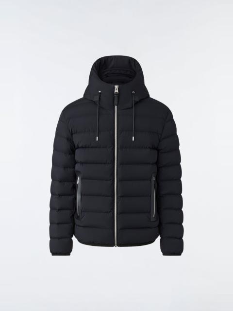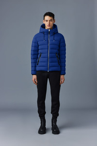 JACK is an AGILE-360 ultra light rcycled down jacket for men featuring an adjustable storm visor hood. Expertly tailored to a regular fit, the 2-way stretch shell offers ease of movement while the elastic trims and drawcord hem enhance the comfortable feel. It is water resistant and repellent, and the centre front zip is accented with edgepainted leather tape. Modern and classic, an effortless staple. - AGILE-360 ultra light down jacket - 100% recycled down - 800 fill power - Moderate Cold: Down to -15°C - 2-way stretch shell - Water resistant and repellent - Hood with adjustable drawcord storm visor - Centre front zip closure - Insulated zip waist pockets with edgepainted leather tape - embossed leather placket - Elastic hem with adjustable drawcord - Elastic cuffs - Signature M logo patch on left sleeve - Regular fit SIZE & FIT - REGULAR – Classic fit allowing comfort and style. - Designed to be worn with heavier layers. - The model is 6'2" (187 cm) and wears a size 40. - Coat length from shoulder to hem: 27'' / 68.58 cm. COMPOSITION & CARE INSTRUCTIONS - Shell: 82% polyamide/nylon, 18% elastane/spandex. Filling: 90% goose down, 10% goose feathers. - Dry clean by leather specialist using oil based solvent only. Do not use perchloroethylene.