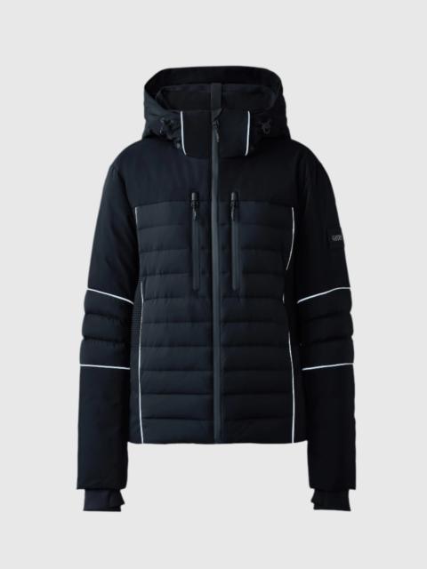 JASPER is a technical ski jacket with quilted down fill and elasticized smocked detail for a bold style and water resistant and wind proof protection. Engineered for adaptability in various conditions, it has active storm cuffs with thumb hole, a goggle cleaner, and under-arm eyelets for ventilation. Featuring ample storage room with zipper chest pockets, ski pass pocket at left sleeve, and inside pocket. A meticulously detailed ski jacket perfect for any day out in the mountains. - Down filled technical ski jacket - Elasticized smocked detail - Hood with storm visor - Water resistant and repellent - Windproof - Removable powder skirt - Water resistant zippers at center front, waist and chest pockets - Piping detail - Goggle cleaner and key holder - Under-arm eyelets for ventilation - Zip ski pass pocket with logo patch at left sleeve - Adjustable drawcord at bottom hem - Inside pocket - Fully lined - Machine washable - Regular fit - Down to -10 SIZE & FIT - REGULAR – Classic fit allowing comfort and style. - Designed to be worn with heavier layers. - The model is 6'2" (187 cm) and wears a size 40. - Coat length from shoulder to hem: 26'' / 66 cm. COMPOSITION & CARE INSTRUCTIONS - Shell: 84% polyamide/nylon, 16% elastane/spandex. Combo shell: 82% recycled nylon, 18% elastane/spandex. Lining: 100% recycled nylon. Filling: 90% duck down, 10% feathers. Water-repellent and water-resistant. - Close zippers. Remove fur. Remove all removable trims.wash inside out. Wash in domestic machine in water not exceeding 40°C, at normal setting. Use mild detergent. Remove immediately after washing. Do not soak. Tumble dry low heat with tennis balls, until fully dried (1 to 3 hours). Do not wet-clean. Do not bleach. Do not wring. Do not iron or press. Dry clean using oil-based solvent only. Do not use perchloroethylene.