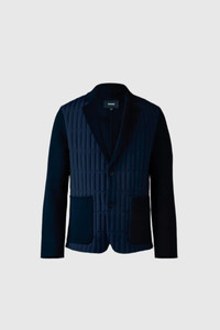 JOHN is a sustainable mixed-media blazer-style jacket made from soft double-face wool. Tailored to a fitted cut, vertical quilting details the body adding signature style and enabling the garment to move with the wearer. Notched lapel and single-breasted button closure add classic detailing. A fusion of timeless styling with modern accents. DETAILS - Mixed-media blazer-style jacket - 100% double-face virgin wool - Vertical quilt body - GRS-certified recycled materials - Single-breasted closure with buttons - Patch pockets with logo or 'Mackage' silicone branding - Front body lined - Horn buttons - Fitted SIZE & FIT - FITTED – Our signature fit, closest to the body. - Designed to be worn with light layers, all while keeping you warm. - For heavier layering, we recommend sizing up. - The model is 6'2" (187 cm) and wears a size 40. - Coat length from shoulder to hem: 28'' / 71 cm. COMPOSITION & CARE - Shell: 100% wool. Combo shell: 82% recycled nylon, 18% elastane/spandex. Lining: 100% polyester. Filling: 90% GRS-certified duck down, 10% feathers. - Dry clean by leather specialist using oil-based solvent only. Do not use perchloroethylene.