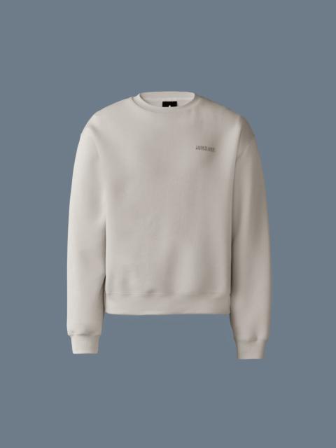 JULIAN is a crewneck sweatshirt crafted from incredibly soft and durable double-face jersey. Cut to a relaxed fit with drop shoulders and a signature "MACKAGE" logo at chest. The rib knit crew collar, cuffs, and hem imbue classic styling. A luxe update to a lounge essential. DETAILS - Double-face Jersey crewneck sweater - Signature "MACKAGE" silicone logo at chest - Rib-knit collar, cuffs, and hem - Machine Washable - Relaxed-fit SIZE & FIT - RELAXED – Loose fit for on the go comfort. - Designed to be worn with heavier layers. - Female model is 5'11" (180 cm) and wears a size S. - Male model is 6'2" (187 cm) and wears a size L. - Length from shoulder to hem: 24 ½'' / 62 cm. COMPOSITION & CARE - Shell: 53% cotton, 47% polyester. Combo: 72% polyamide/nylon, 27% polyester, 1% elastane/spandex. - Wash in domestic or commercial machine in water not exceeding 30°C at normal setting. Wash inside out. Use mild detergent. Wash with similar colors. Remove immediately after washing. Do not tumble dry. Iron with or without steam by hand, or press on commercial equipment, at low temperature (not exceeding 110°C). Do not bleach. Dry clean using oil based solvent only. Do not use perchloroethylene.