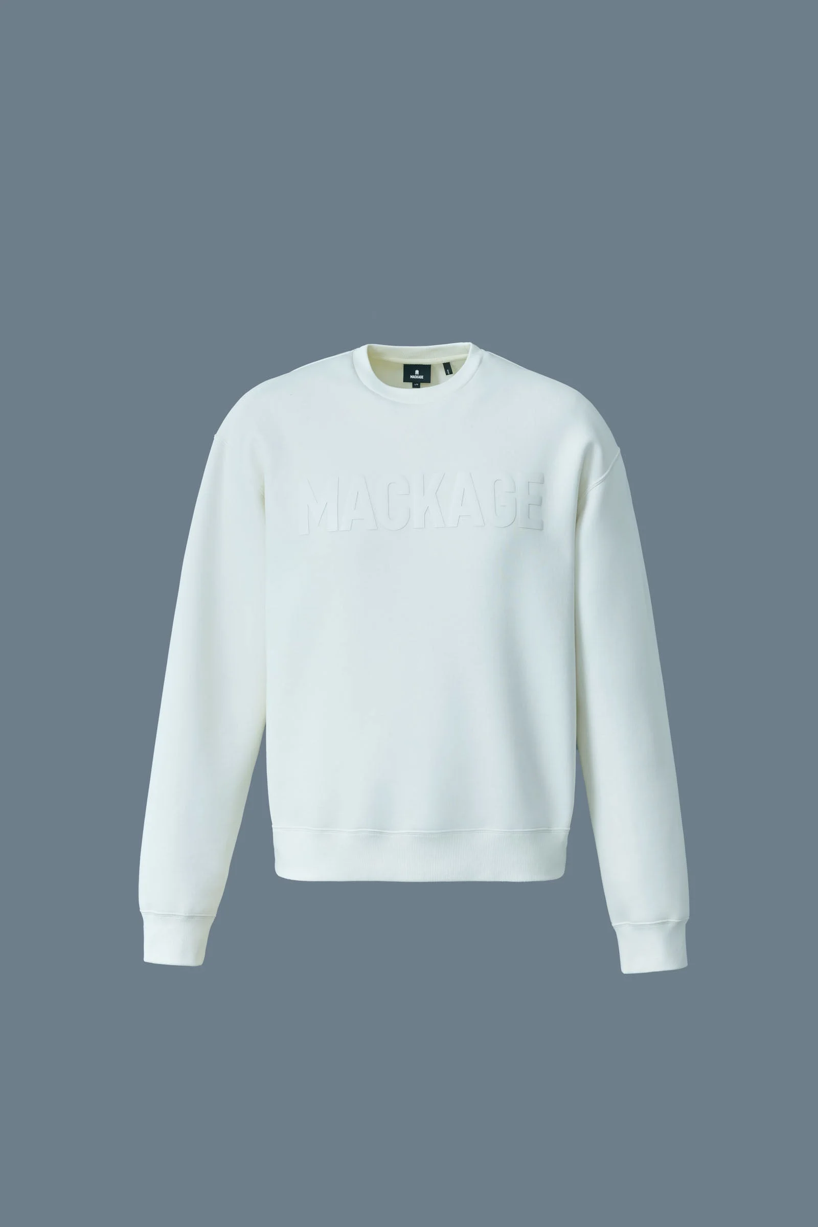 JULIUS is a crewneck sweatshirt crafted from ultra-soft and durable double-face jersey. Designed for a relaxed fit with dropped shoulders and a bold signature MACKAGE logo across the chest. Rib knit collar, cuffs, and hem offer a structured yet comfortable silhouette. A modern essential with everyday appeal. - Double-face Jersey crewneck sweater - Signature "MACKAGE" silicone logo at chest - Rib-knit collar, cuffs, and hem - Machine Washable - Relaxed-fit SIZE & FIT - RELAXED – Loose fit for on the go comfort. - Designed to be worn with heavier layers. - The model is 6'2" (187 cm) and wears a size L. - Jumper length from shoulder to hem: 27.75'' / 70 cm COMPOSITION & CARE INSTRUCTIONS - Shell: 53% cotton, 47% polyester. - Wash in domestic or commercial machine in water not exceeding 30°C at normal setting. Wash inside out. Use mild detergent. Wash with similar colors. Remove immediately after washing. Do not tumble dry. Iron with or without steam by hand, or press on commercial equipment, at low temperature (not exceeding 110°C). Do not bleach. Dry clean using oil-based solvent only. Do not use perchloroethylene.