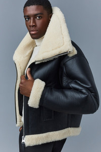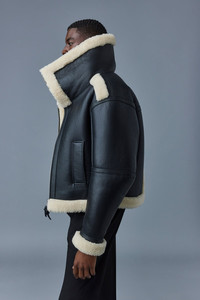LOTTE is a luxurious sheepskin jacket for men featuring fine edge painting finishing throughout. Ultra soft shearling trim covers the jacket throughout providing a warm and comfortable layer for the cold days down to -20ºc. Dramatic double removable stand collars add a unique eye-catching detail while providing extra coverage for high winds. The oversized fit is complimented by articulated sleeves and dropped shoulders. Shearling zipper pockets and leather welt pockets offer ample storage room for essentials. An inspired take on an enduring piece of men’s outerwear. - Sheepskin bomber jacket - Dropped shoulders - Articulated sleeves - Shearling trim throughout - Welt pockets at front waist - Shearling zipper pockets at front - Double zip front opening - Removable double-stand collar - Zip sleeve vent (no gusset) - Edge-painted finishing throughout - Oversized fit - Made in Turkiye SIZE & FIT - OVERSIZED – Casual and cool fit for layering. - Designed to be worn with heavy layers or alone for an edgy look. - For a more fitted look or for petite customers, we recommend to size down. - The model is 6'2" (187 cm) and wears a size 40. - Length from shoulder to hem: 24 ¾'' / 62 cm. COMPOSITION & CARE INSTRUCTIONS - Shell: 100% sheepskin. - Dry clean by leather specialist using oil-based solvent only. Do not use perchloroethylene. This garment is a luxury item made of genuine sheepskin. The fine skins used to make this garment have been treated and conditioned. Skins may present slight variations in colour, which is not a defect, but a natural characteristic. -Slight transfer of colour may occur when being worn for the first few times. Great care should be taken when wearing and handling. -Garment should be dry cleaned by a leather specialist only, with all closures and trims closed or removed. -Garment must be stored in the original garment bag, never in plastic polybag. -Use proper size hanger to maintain the shape of the coat. -Prevent the humidity since it is natural shearling. With humidity, appearance might affected. -Exposure to rain should be avoided; water may cause staining and may affect the texture of the sheepskin. -If exposed to rain, let it dry in cool ventilated area, away from any heat source and direct sunlight. -Do not steam shearling, but use fur brush if needed.