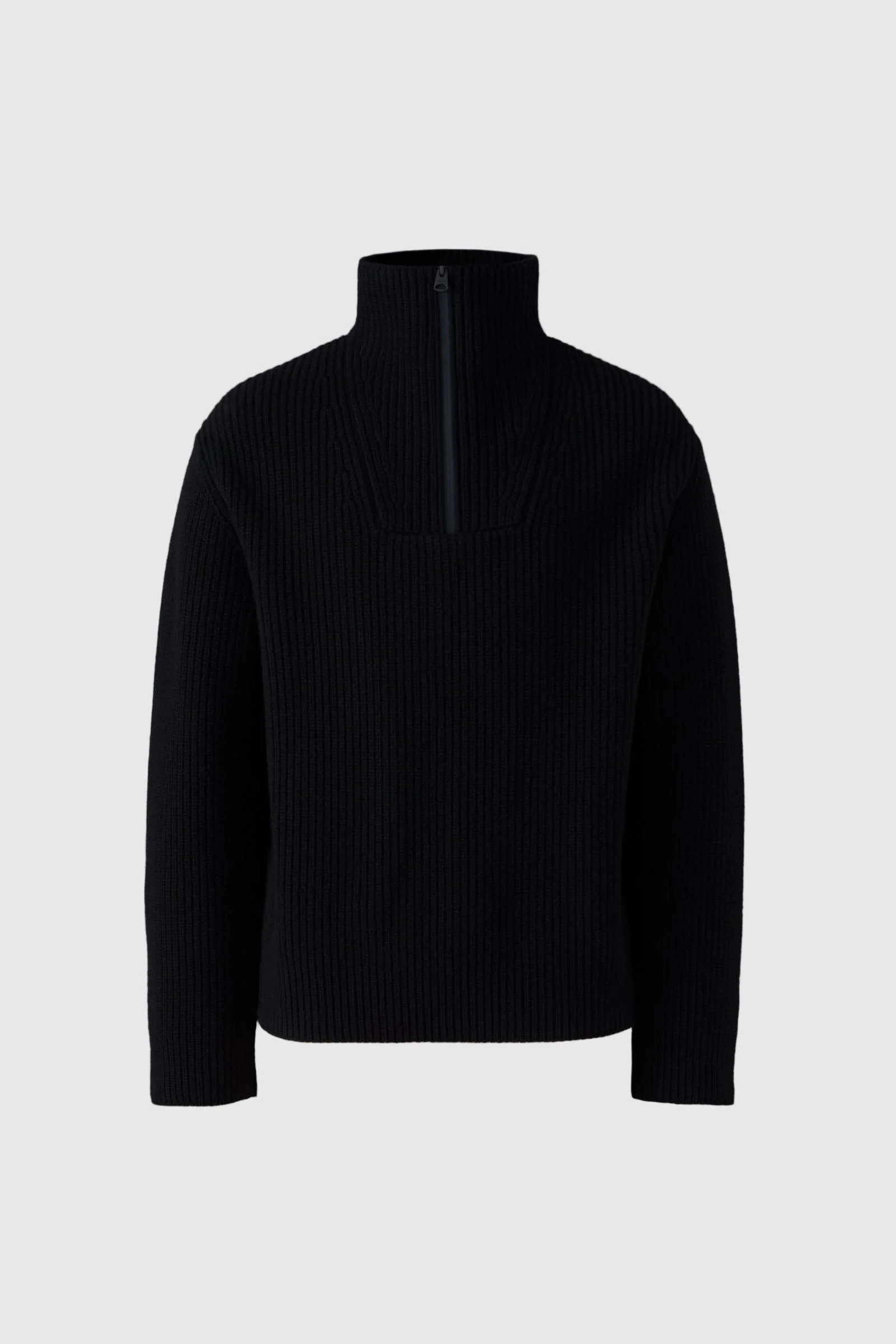 MARIO is a fisherman rib pullover crafted in a heavy gauge knit for textural structure and durability. Designed with a quarter neck zip and fully fashioned construction at the armholes and collar, it blends functionality and craftsmanship. A water-resistant center front zipper completes this cold-season staple with a technical edge. DETAILS - Fisherman rib knit pullover - Water-resistant zipper at center front - Quarter neck zip - Fully fashioned construction at armhole and collar - Unlined - Relaxed fit SIZE & FIT - RELAXED – Loose fit for on the go comfort. - Designed to be worn with heavier layers. - The model is 6'2" (187 cm) and wears a size L. - Coat length from shoulder to hem: 26'' / 75 cm. COMPOSITION & CARE - Shell: 100% virgin wool. - Wash gently by hand in water not exceeding 30°C. Use mild detergent.Wash with similar colors. Remove immediately after washing. Do not tumble dry. Dry flat. Iron with or without steam by hand, iron inside out, at low temperature (not exceeding 110°C). Do not bleach. Dry clean using oil-based solvent only. Do not use perchloroethylene.