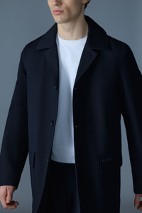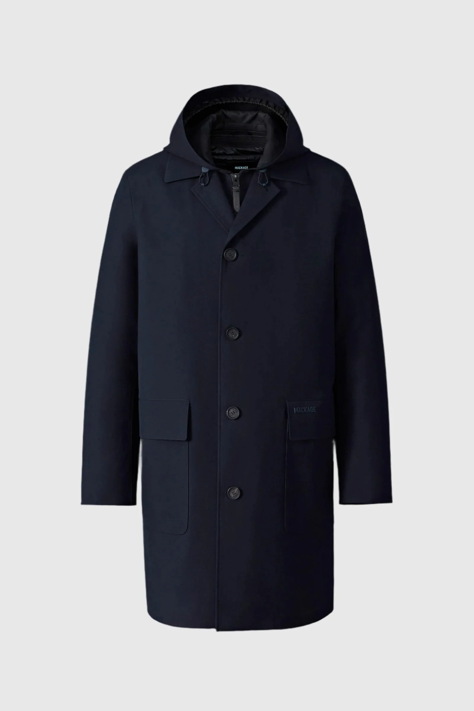 MATHIAS is a versatile 3-in-1 Balmacaan coat combining classic styling with functional adaptability. It features a removable down liner for added warmth and a removable shell bib with an adjustable hood and storm visor for extra weather protection. Designed with a seam-sealed construction, details include horn buttons, adjustable cuffs, and large double entry patch pockets. Weather-ready outerwear suitable for any occasion. DETAILS - 3-in-1 Balmacaan coat - Water-repellent, resistant, and windproof - Removable down liner and shell bib with hood - Seam-sealed construction for weather protection - Button front closure - Adjustable storm visor with drawcord - Adjustable sleeve cuffs with snaps - Large patch pockets and welt pockets with flap - Vent at center back - Two interior patch pockets on the front lining wall - MACKAGE silicone branding at pocket - Horn buttons SIZE & FIT - REGULAR – Classic fit allowing comfort and style. - Designed to be worn with heavier layers. - The model is 6'2" (187 cm) and wears a size 40. - Coat length from shoulder to hem: 39 ¼'' / 100 cm. COMPOSITION & CARE - Shell: 70% polyester, 30% rayon. Lining: 100% recycled nylon. Filling: 90% down, 10% feathers. Water repellant & water resistant. - Outer shell: Dry clean by a leather specialist using only oil-based solvent. Do not use perchloroethylene. - Removable liner: Close zippers. Remove fur. Remove all removable trims. Wash inside out. Wash in domestic machine in water not exceeding 40°C, at normal setting. Use mild detergent. Remove immediately after washing. Do not soak. Tumble dry low heat with tennis balls, until fully dried (1 to 3 hours). Do not wet-clean. Do not bleach. Do not wring. Do not iron or press. Dry clean using oil-based solvent only. Do not use perchloroethylene.