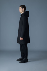 MATHIAS is a versatile 3-in-1 Balmacaan coat combining classic styling with functional adaptability. It features a removable down liner for added warmth and a removable shell bib with an adjustable hood and storm visor for extra weather protection. Designed with a seam-sealed construction, details include horn buttons, adjustable cuffs, and large double entry patch pockets. Weather-ready outerwear suitable for any occasion. DETAILS - 3-in-1 Balmacaan coat - Water-repellent, resistant, and windproof - Removable down liner and shell bib with hood - Seam-sealed construction for weather protection - Button front closure - Adjustable storm visor with drawcord - Adjustable sleeve cuffs with snaps - Large patch pockets and welt pockets with flap - Vent at center back - Two interior patch pockets on the front lining wall - MACKAGE silicone branding at pocket - Horn buttons SIZE & FIT - REGULAR – Classic fit allowing comfort and style. - Designed to be worn with heavier layers. - The model is 6'2" (187 cm) and wears a size 40. - Coat length from shoulder to hem: 39 ¼'' / 100 cm. COMPOSITION & CARE - Shell: 70% polyester, 30% rayon. Lining: 100% recycled nylon. Filling: 90% down, 10% feathers. Water repellant & water resistant. - Outer shell: Dry clean by a leather specialist using only oil-based solvent. Do not use perchloroethylene. - Removable liner: Close zippers. Remove fur. Remove all removable trims. Wash inside out. Wash in domestic machine in water not exceeding 40°C, at normal setting. Use mild detergent. Remove immediately after washing. Do not soak. Tumble dry low heat with tennis balls, until fully dried (1 to 3 hours). Do not wet-clean. Do not bleach. Do not wring. Do not iron or press. Dry clean using oil-based solvent only. Do not use perchloroethylene.