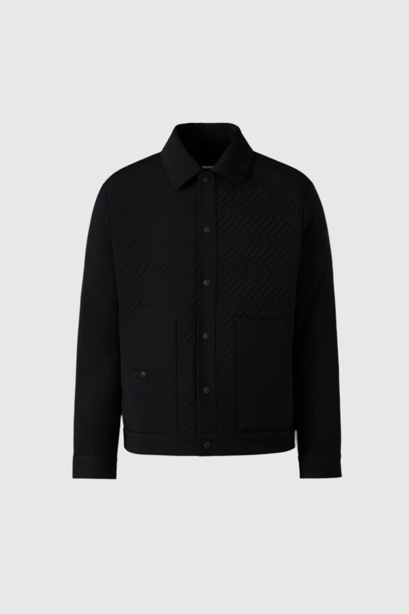 MAXWELL is a regular-fit, down-filled shirt jacket crafted from recycled materials, designed for warmth without the weight. Featuring a chevron-quilted body, this jacket combines function with a modern aesthetic. Key details include a shirt collar, adjustable cuffs, and large patch pockets. Ideal for layering, coverage down to -5°C. DETAILS - Quilted down shirt jacket - Chevron-quilted body with down fill - Center front snap closure - Shirt collar - Adjustable sleeve cuffs with snap - Welt pocket with snap closure - Large patch pockets - MACKAGE silicone branding at pocket - Unlined - Machine washable - Temperature rating: -5°C SIZE & FIT - REGULAR – Classic fit allowing comfort and style. - Designed to be worn with heavier layers. - The model is 6'2" (187 cm) and wears a size 40. - Coat length from shoulder to hem: 27'' / 69 cm. COMPOSITION & CARE - Shell: 82% recycled nylon, 18% elastane/spandex. Lining: 82% recycled nylon, 18% elastane/spandex. Filling: 90% down, 10% feathers. Water repellant. - Close zippers. Remove fur. Remove all removable trims. Wash inside out. Wash in domestic machine in water not exceeding 40°C, at normal setting. Use mild detergent. Remove immediately after washing. Do not soak. Tumble dry low heat with tennis balls, until fully dried (1 to 3 hours). Do not wet-clean. Do not bleach. Do not wring. Do not iron or press. Dry clean using oil-based solvent only. Do not use perchloroethylene.