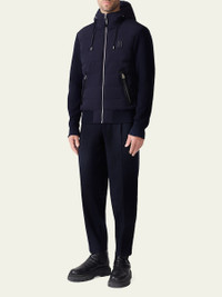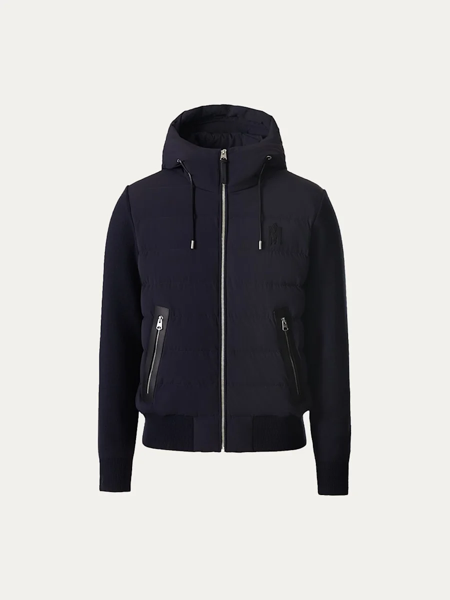 Cleverly crafted with GRScertified recycled down, the Mackage "AndrewZ" jacket features a mixedmedia design. Note the channelquilt front paired with the knit sleeves and back of the hybrid jacket. Approx. 25.75" center back length Drawcord hood Knit long sleeves Center front zipper closure Waist pockets with zippers Edgepainted leather pocket reinforcements Banded cuffs and hem Nylon/spandex Contrast: Wool/acrylic/polyester/spandex Fill: GRScertified recycled down Dry clean, leather method dry cleaning Imported