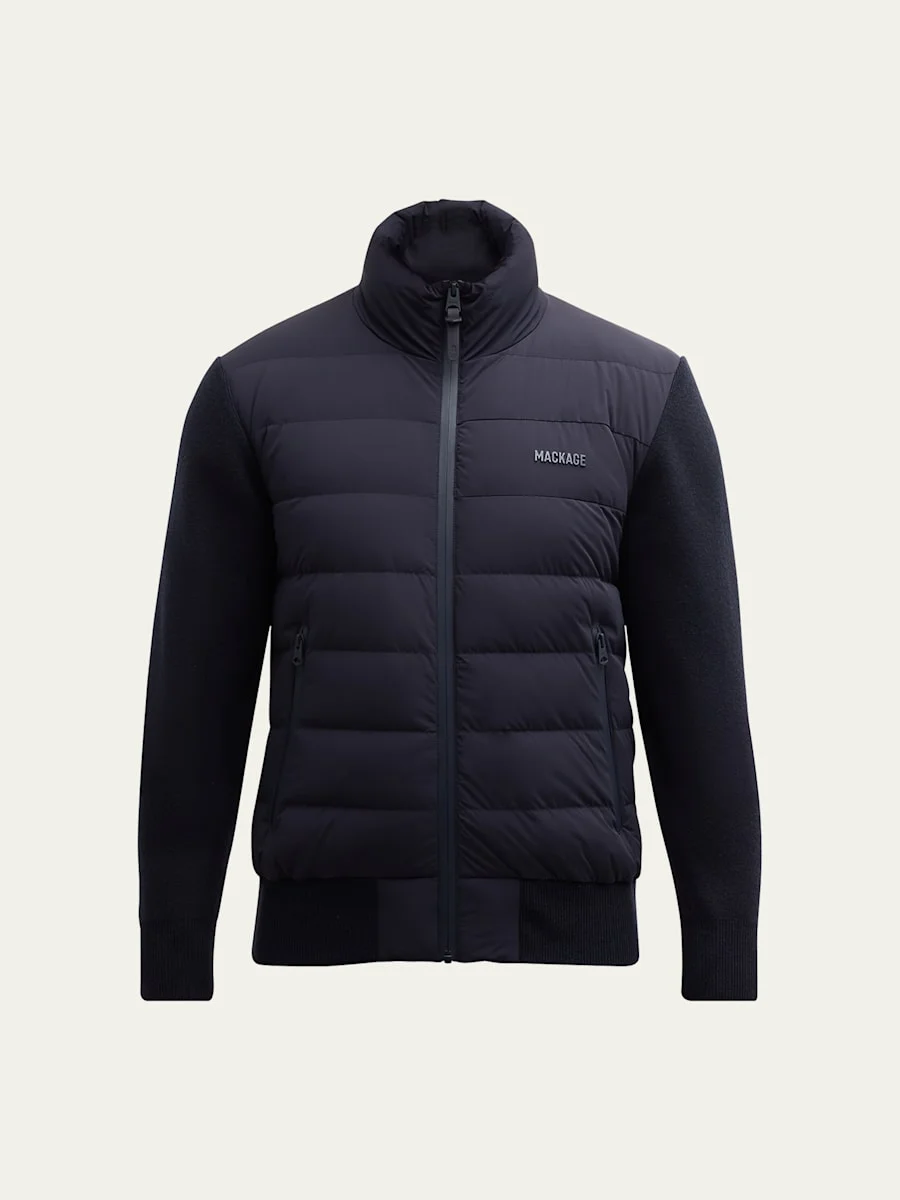 Mackage "Haney" hybrid water-resistant jacket boasts a cardigan silhouette Stand collar; front-zip closure Long sleeves; rib-knit cuffs Signature M logo Front welt pockets 800 fill power Regular fit Nylon/polyamide/elastane/wool Lining: Recycled nylon/elastane GRS-certified sustainable down fill Machine wash Imported Model is 6'1"/185cm. Online Inquiries: BGS21_NBLJF| Store Inquiries: #4665980