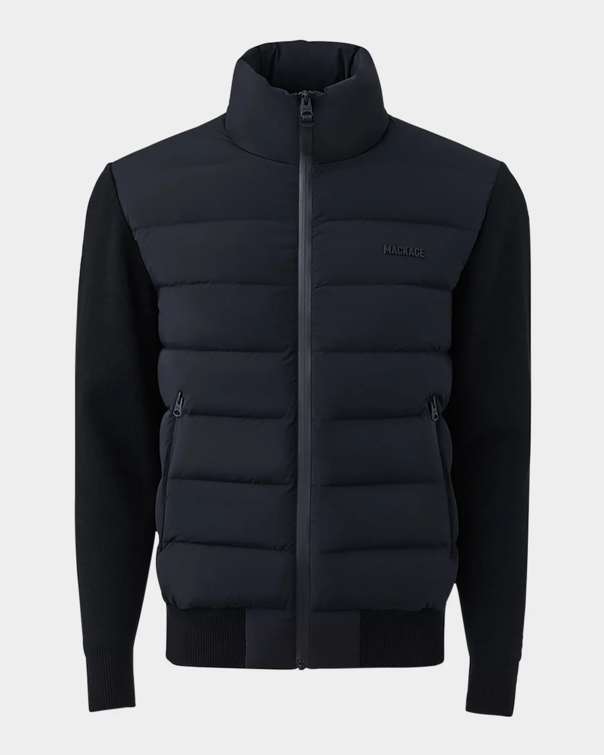 - Mackage "Haney-City" hybrid light-down jacket with cardigan silhouette - Agile-360 two-way stretch material - Funnel neckline - Water-resistant front zipper closure - Signature MACKAGE logo at chest - Water-resistant waist pockets - Rib knit cuffs and hem - Regular fit - Down/feather 800 fill power - Nylon/polyamide/elastane/wool - Dry clean - Imported