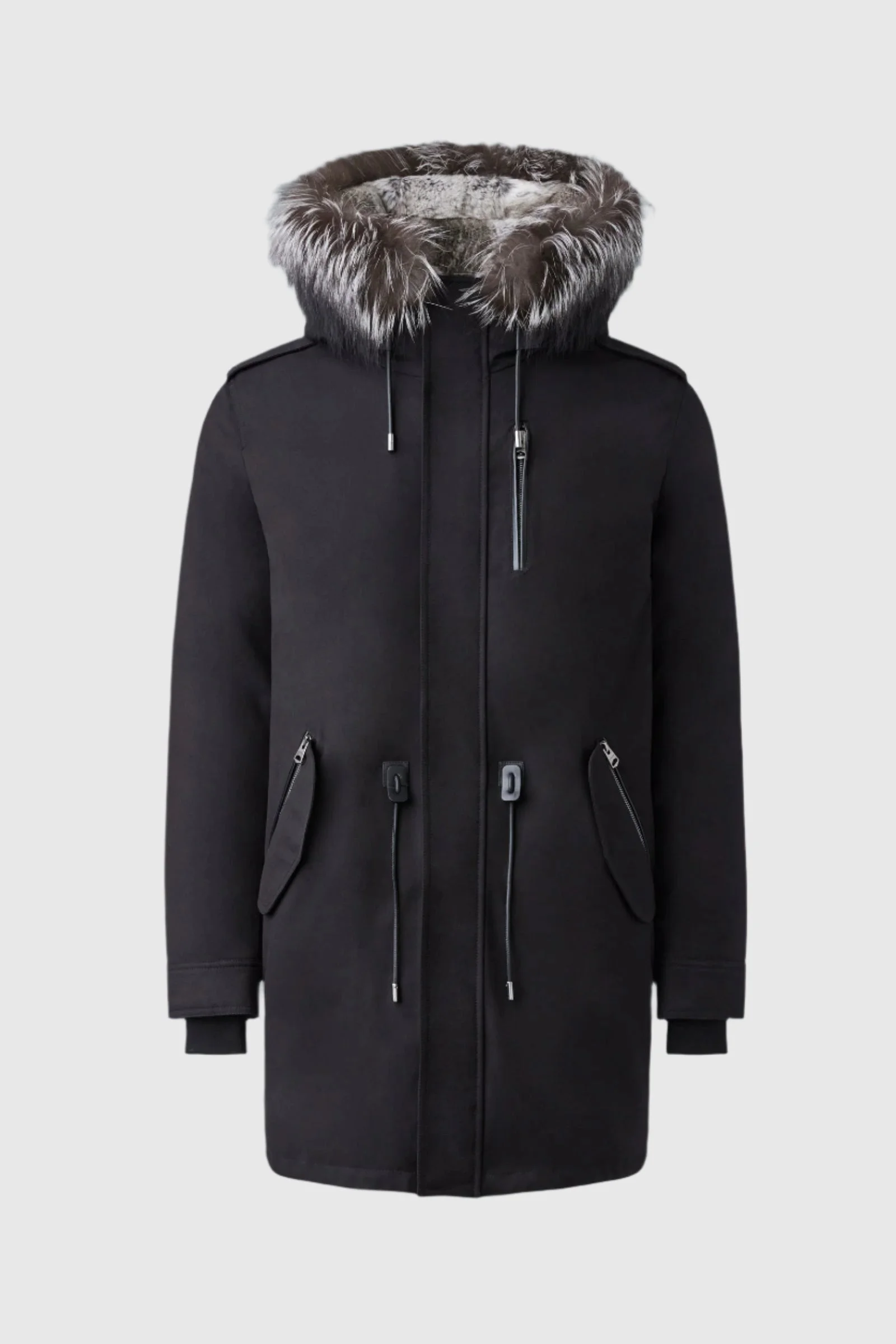 MORITZ is a twill parka for men with a removable silver fox fur trim around the hood. Water resistant, repellent, and windproof, it features a body and hood lined with luxurious rabbit fur. Storm cuffs, down-lined sleeves and (R) Leather drawcords at the waist improve heat retention. Plush construction meets high-performance in this elevated winter essentail engineered for superior protection. - Twill parka with body and hood lined in rabbit fur - 800 fill power - Arctic rated: Down to -25°C - Removable silver fox fur trim at hood - Double-entry zippered pockets with (R) Leather trim - (R) Leather drawcords at waist and hood - (R) Leather-trimmed chest pocket - Storm cuffs - Relaxed fit SIZE & FIT - RELAXED – Loose fit for on the go comfort. - Designed to be worn with heavier layers. - Coat length from shoulder to hem: 42.5'' / 107.95 cm. COMPOSITION & CARE INSTRUCTIONS - Shell : 70% polyester, 30% polyamide/nylon. Lining: 100% polyester. Filling: 90% duck down, 10% feathers. Fur: 100% finland silver fox. Fur 2: 100% rabbit. - Dry clean by leather specialist using oil based solvent only. Do not use perchloroethylene.