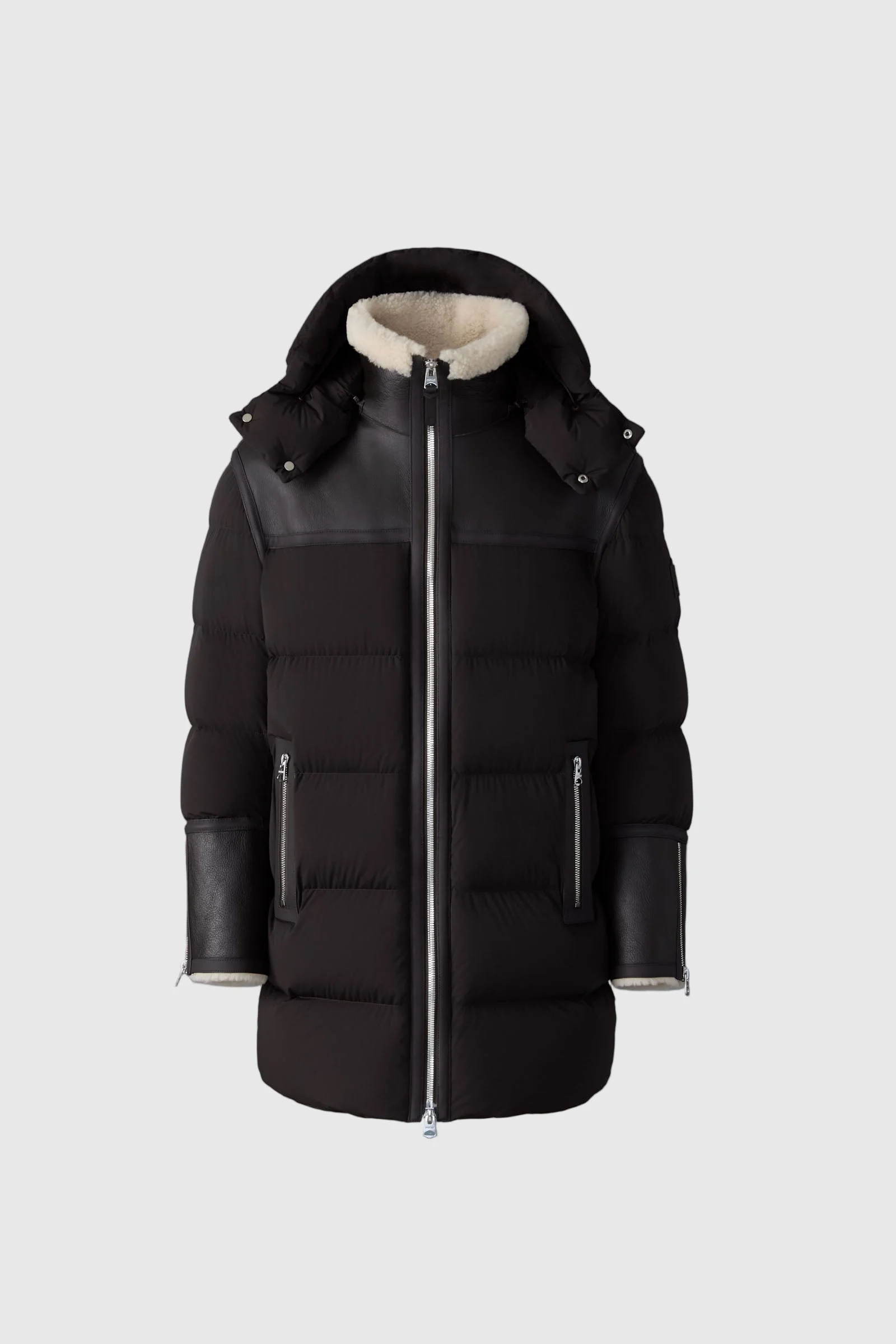NICHOLAS is a sustainably-made mixed-media quilted down parka with plush shearling paneling throughout. Water-resistant and repellent, a storm visor hood and adjustable bungee at hem add utilitarian performance and create a striking silhouette. Expertly designed from top to bottom with leather tape detailing and stand collar with removable hood. A standout hybrid winter staple with a contemporary cut. DETAILS - Long mixed media quilted down parka - 750+ fill power - Cold protection: Down to -25°C - Shearling-stand collar - Shearling panels at front yoke and sleeve cuffs - Edge painted leather pocket reinforcements - Stand collar with removable hood - Adjustable hood opening with bungee - Center front zip closure with leather tape - Insulated zip waist pockets - Inner welt pockets with zippers - Signature M logo patch on left sleeve - Fully lined - Regular fit SIZE & FIT - REGULAR – Classic fit allowing comfort and style. - Designed to be worn with heavier layers. - The model is 6'2" (187 cm) and wears a size 40. - Coat length from shoulder to hem: 25.75'' / 65 cm. COMPOSITION & CARE - Shell: 82% recycled nylon, 18% elastane/spandex. Combo shell: 100% sheepskin. Combo: 100% lamb leather. Lining: 82% recycled nylon, 18% elastane/spandex. Filling: 90% duck down, 10% feathers. water-resistant. - Dry clean by leather specialist using oil-based solvent only. Do not use perchloroethylene.