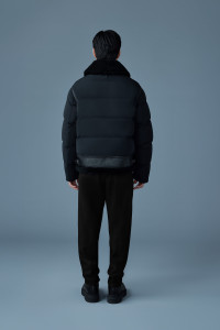 ROBERT is a sustainably made mixed-media recycled quilted down jacket with plush shearling paneling throughout. Water-resistant and repellent, the aviator style and leather tape detailing add striking lines to the regular cut. Expertly crafted, a hybrid winter staple with a contemporary design. DETAILS - Short mixed media quilted down jacket - 750+ fill power - Moderate Cold: Down to -20°C - Shearling-trimmed spread collar and bottom hem - Center front zip closure with leather tape - Insulated zip waist pockets - Signature M logo patch on left sleeve - Collar tab with snaps - Zipper vent at cuffs - Inner welt pockets with zippers - Adjustable waist tabs - Regular fit SIZE & FIT - REGULAR – Classic fit allowing comfort and style. - Designed to be worn with heavier layers. - The model is 6'2" (187 cm) and wears a size 40. - Coat length from shoulder to hem: 26.5'' / 67 cm. COMPOSITION & CARE - Shell: 82% recycled nylon, 18% elastane/spandex. Combo shell: 100% sheepskin. Combo: 100% lamb leather. Lining: 82% recycled nylon, 18% elastane/spandex. Filling: 90% duck down, 10% feathers. Water-repellent and water-resistant. - Dry clean by leather specialist using oil-based solvent only. Do not use perchloroethylene.