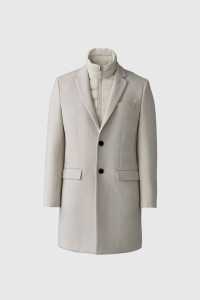 SKAI-SLB is a classic single-breasted two-button top coat made from elegant double-faced wool The 3-in-1 construction features a removable down liner for adaptive protection. Outfitted with horn buttons—a versatile and elevated multi-season staple. DETAILS - 3 in-1 double-faced virgin wool coat - RWS responsible wool standard - Moderate Cold: Down to -5°C - Removable down liner + removable down bib - Single-breasted with two-button closure - Centre front zipper closure at bib - Leather outer collar stand - Inside pocket - Inner welt pocket with zipper - Welt pockets - Vent at centre back - Horn buttons - Regular fit SIZE & FIT - REGULAR – Classic fit allowing comfort and style. - Designed to be worn with heavier layers. - The model is 6'2" (187 cm) and wears a size 40. - Coat length from shoulder to hem: 37'' / 94 cm. COMPOSITION & CARE - Shell: 100% wool. Combo shell: 100% lamb leather. Lining: 52% polyester, 48% viscose. Combo lining: 100% recycled nylon. Filling: 90% duck down, 10% feathers. - Outer jacket: Dry clean by leather specialist using oil-based solvent only. Do not use perchloroethylene. - Removable liner only: Close zippers. Remove fur. Remove all removable trims. Wash inside out. Wash in domestic machine in water not exceeding 40°C, at normal setting. Use mild detergent. Remove immediately after washing. Do not soak. Tumble dry low heat with tennis balls, until fully dried (1 to 3 hours). Do not wet-clean. Do not bleach. Do not wring. Do not iron or press. Dry clean using oil-based solvent only. Do not use perchloroethylene.