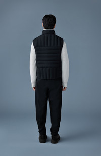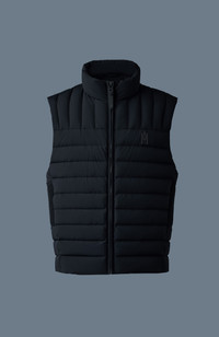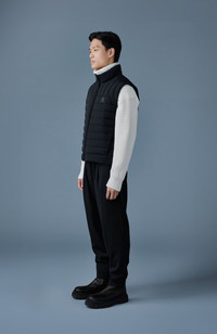 TITUS is a light down vest with a stand collar and zip front closure. The striking perpendicular down channeled shell is constructed with water resistant and repellent materials. Inseam pockets offer storage while smocked elasticized detail adds bold detail and greater range of movement. A unique light layer for transitional weather - Light stretch down vest - 750+ fill power - Light: Down to 5°C - Perpendicular down channeling - Smocked elasticized detail - Center front zip closure with stand collar - Inner welt pockets with zipper - Inseam pockets at waist - Fully lined - Regular fit SIZE & FIT - REGULAR – Classic fit allowing comfort and style. - Designed to be worn with heavier layers. - The model is 6'2" (187 cm) and wears a size 40. - Coat length from shoulder to hem: 24.75'' / 63 cm. COMPOSITION & CARE INSTRUCTIONS - Shell: 82% recycled nylon, 18% elastane/spandex. Lining: 82% recycled nylon, 18% elastane/spandex. Filling: 90% goose down, 10% feathers. Water-repellent and water-resistant. - Dry clean by leather specialist using oil-based solvent only. Do not use perchloroethylene.