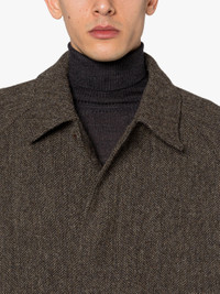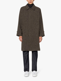 Description Drawing from Mackintosh’s rich British heritage, the Belford coat is cut to a Balmacaan-inspired shape from herringbone Shetland tweed. Its relaxed profile is compounded by the raglan sleeves and streamlined silhouette. Size & Fit Model is 187cm and wears size 38/M Details & Care Belford Brown Wool Balmacaan Coat Dark brown Point collar Long raglan sleeves with button adjusters at cuffs Slip side pockets with button fastening Single vent Internal hanging chain loop Concealed button front fastening Regular fit 100% wool; lining: 100% cupro Fabric weight: 380g m (148cm) Dry clean only Made in the United Kingdom Style ID: MO8939 Model: BELFORD GM-1168F/WO AJS04