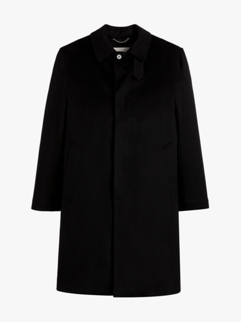 Description The signature Dunkeld coat is expertly constructed at our factory from Loro Piana Rain System® wool that's both water-repellent and lightweight. It's cut to a refined silhouette with a neat, concealed button placket and traditional throat latch. Size & Fit Model is 187cm and wears size 38/M Details & Care Dunkeld Black Rain System Wool 3/4 Coat Black Water-repellent Point collar Detachable throat latch with button fastening Long sleeves Slip side pockets Single vent Internal hanging chain loop Concealed button front fastening Regular fit 100% wool; lining: 100% cupro Fabric weight: 247g / m² Dry clean only Made in the United Kingdom Style ID: MO8943 Model: DUNKELD GM-1140F/WO AAU03