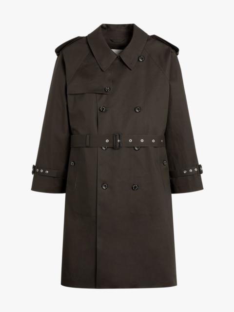 Description Rooted in tradition, the Earlston trench coat is meticulously handcrafted in our factory in Scotland from waterproof bonded cotton using time-honoured techniques that date back to the early 19th century. Hallmark elements – like the double-breasted silhouette, epaulettes and storm flaps – remain, while silver-tone eyelets and the belt and cuffs bring it up to date. Size & Fit Model is 187cm and wears size 38/M Details & Care Earlston Fawn Bonded Cotton Trench Coat Beige Waterproof Point collar Epaulettes Long raglan sleeves with buckle adjusters at cuffs Underarm eyelets Storm flap with button fastening at chest Detachable waist belt with buckle fastening Slip side pockets with button fastening Storm flap with button fastening at back Single vent Internal hanging loop Fully taped seams Unlined Double-breasted button fastening Oversized fit 100% cotton (bonded) Fabric weight: 373g / ㎡ Do not wash or dry clean Handmade in Scotland Style ID: RO6498 Model: EARLSTON GR-1051 IDJ09