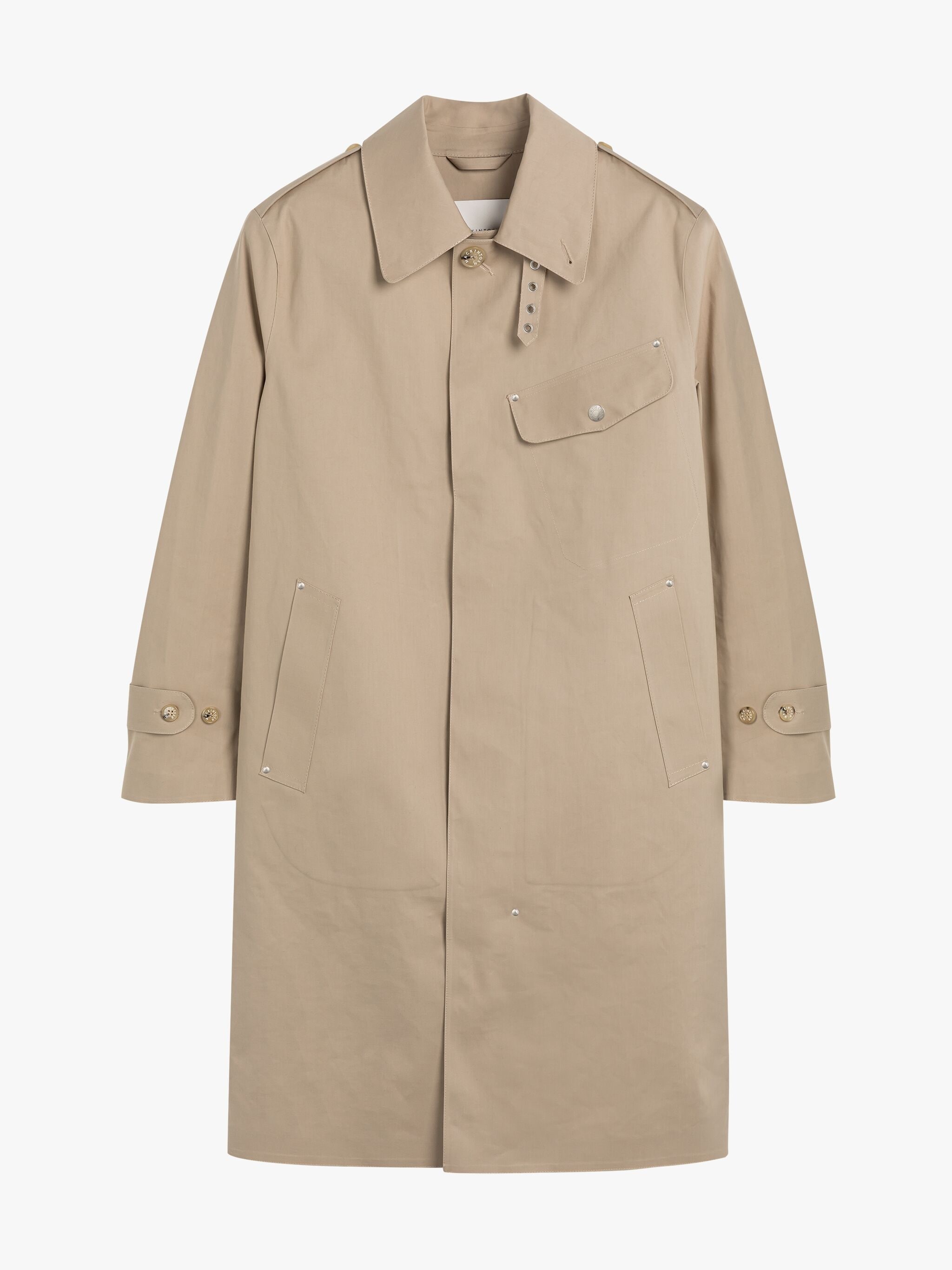 Description A celebration of outerwear heritage, the Gilston takes inspiration from Mackintosh’s 1940s military coat. Meticulously handcrafted in our factory in Scotland from waterproof bonded cotton – using our same tried-and-tested techniques from the 19th century – it’s elevated by silver-tone hardware and a throat latch with biker-inspired eyelets. Size & Fit Model is 187cm and wears size 38/M Details & Care Gilston Fawn Bonded Cotton Coat Beige Waterproof Point collar Throat latch with buckle fastening Epaulettes Long sleeves with button adjusters at cuffs Underarm eyelets Flap chest pocket with press-stud fastening Slip side pockets Single vent Internal hanging loop Fully taped seams Unlined Concealed button front fastening Regular fit 100% cotton (bonded) Fabric weight: 373g / ㎡ Do not wash or dry clean Handmade in Scotland Style ID: RO6493 Model: GILSTON GR-1049 IDJ09
