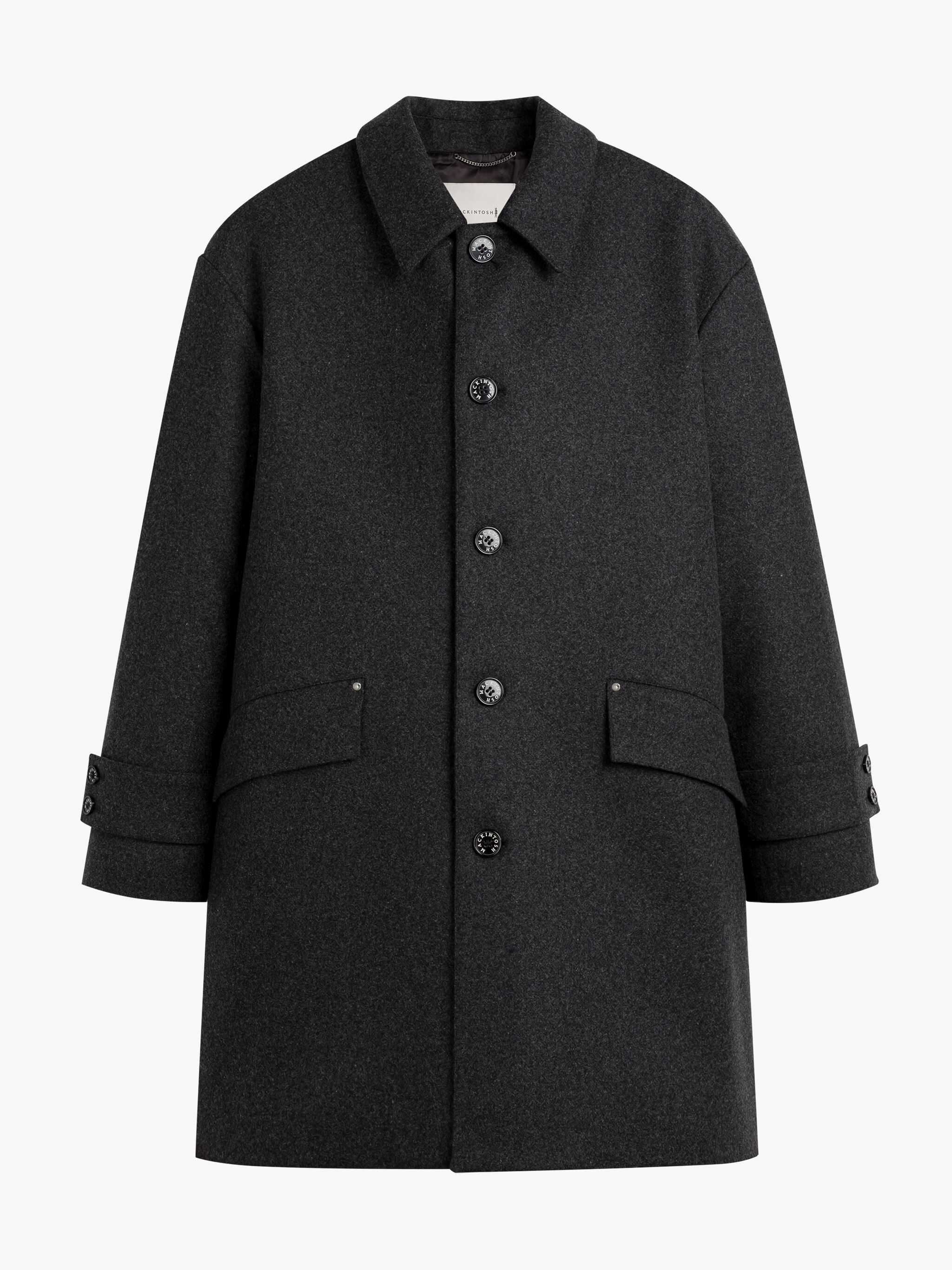 Description Drawing from the Mackintosh archives and heritage outerwear design, the Humbie coat is crafted from wool to a wide, A-line silhouette. Immaculately constructed in the United Kingdom with signature functional elements, it's fitted with a detachable throat latch, cuff adjusters and an internal chain-link loop. Size & Fit Model is 187cm and wears size 38/M Details & Care Humbie Charcoal Wool Overcoat Charcoal grey Point collar Detachable throat latch with button fastening Drop shoulders Long sleeves with button adjusters at cuffs Flap side pockets Internal hanging chain loop Button front fastening Regular fit 100% wool; lining: 100% cupro Fabric weight: 630g m (150cm) Dry clean only Made in the United Kingdom Style ID: MO9031 Model: HUMBIE GTS SL GM-1160F/WO 2K03