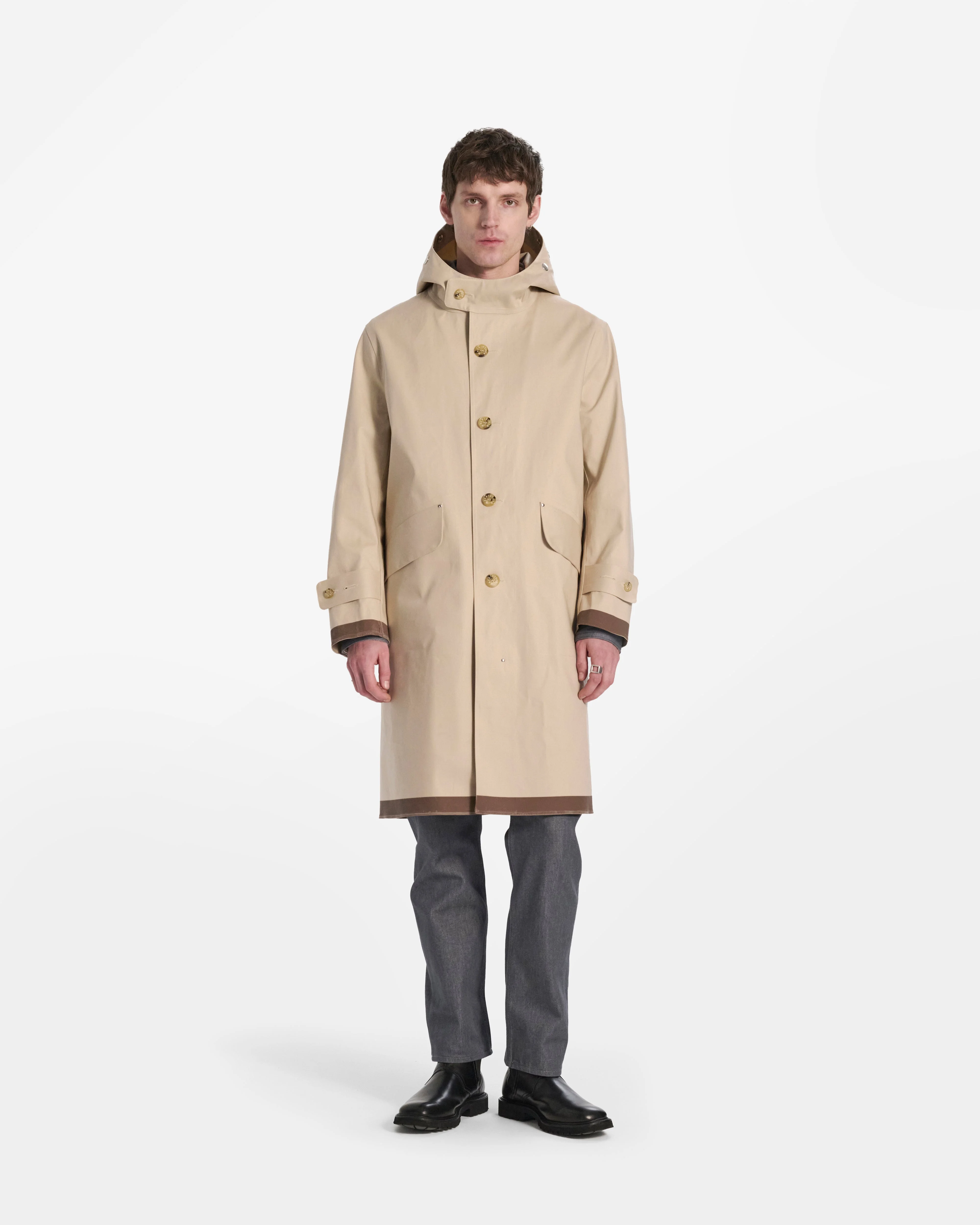 This modern take on the classic deck parka features a hood, back stitching, and branded buttons which all accent the design, whilst the traditional rubberised fabric ensures a 100% waterproof jacket, with hand-taped seams that keeps you dry even on the wettest of days. Made in: Handmade in Scotland Fabric: Rubberised bonded cotton Attributes: Waterproof. Hooded. Single breasted Item code: RO6543 FABRIC & CARE Washing: Spot clean only. Do not machine wash. Do not dry clean. Day to day: Small marks can be removed with soap and water. Apply soap with a soft brush only. Never use spirit or any other chemical cleaners.