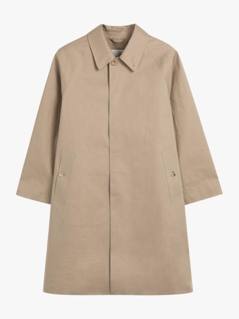 Description The Lauder coat is a prime example of Mackintosh's unparalleled outerwear expertise. A modern iteration of the classic Balmacaan, it's handmade in our factory in Scotland from waterproof bonded cotton using the same tradition pioneered in the early 19th century. Underarm eyelets and cuff adjusters add functional detail. Size & Fit Model is 187cm and wears size 38/M Details & Care Lauder Brown Bonded Cotton Overcoat Dark brown Waterproof Point collar Long raglan sleeves with button adjusters at cuffs Underarm eyelets Slip side pockets with button fastening Single vent Internal hanging loop Fully taped seams Unlined Concealed button front fastening Oversized fit 100% cotton (bonded) Fabric weight: 373g / ㎡ Do not wash or dry clean Handmade in Scotland Style ID: RO6496 Model: LAUDER GR-1050 IDJ140