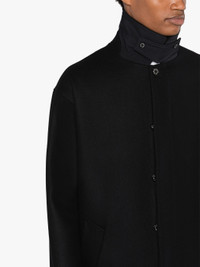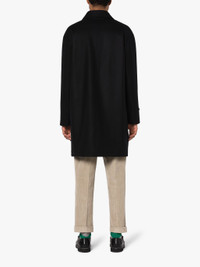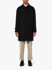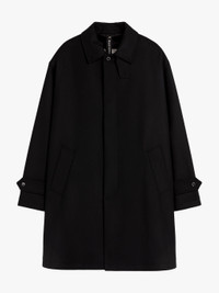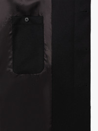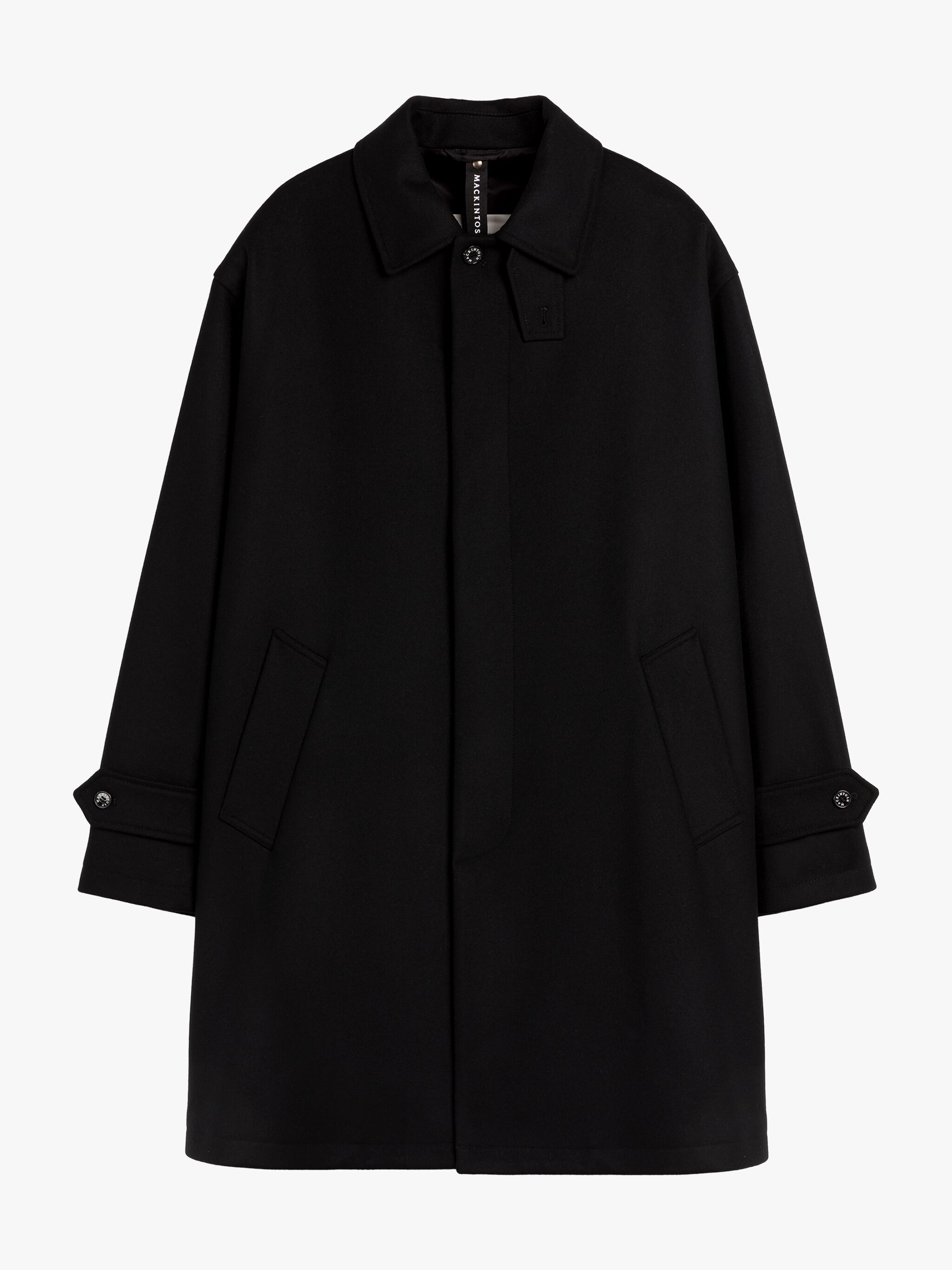 Description The black Soho overcoat is tailored at our factory from insulating wool to a contemporary, relaxed silhouette. Signature Mackintosh details add to its functionality: note the internal phone pocket and tab for the collection's interchangeable liner vests. Size & Fit Model is 185cm and wears size M Consult our size guide for further information Details & Care Soho Black Wool Overcoat Black Point collar Detachable throat latch with button fastening Long sleeves with button adjusters at cuffs Slip side pockets Internal tab with press-stud fastening for interchangeable liner vest Internal phone pocket with button fastening Unlined Concealed button front fastening Relaxed fit 100% wool Dry clean only Made in the United Kingdom Style ID: MO8679 Model: WOOL SOHO GMM-225 2K01