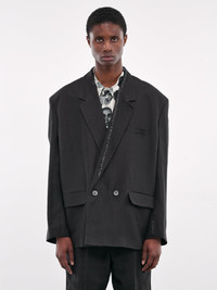 MAGLIANO blazer in black, paneled construction, notched lapel & graphics, front double-breasted button closure, structured shoulders, long sleeves, surgeon's cuffs, chest welt pocket, side welted flap pockets, straight hem, oversized fit. Standard Sizing Model is 6'1" wearing size M. Shoulders: 15.5" Chest: 31" Waist: 26"