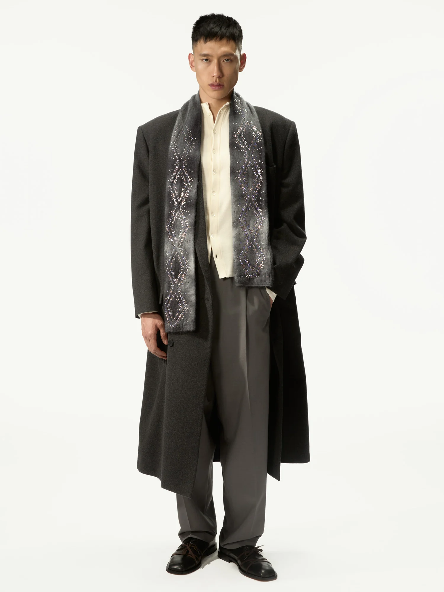 Double-Breasted Coat Crafted From Super Light Beaver Felt Featuring A Back Pocket. Item Composition: 63% Wool, 22% Polyester, 10% Polyamide, 5% Other Fibers Made in Italy Marcello is 186cm tall and wears a size M
