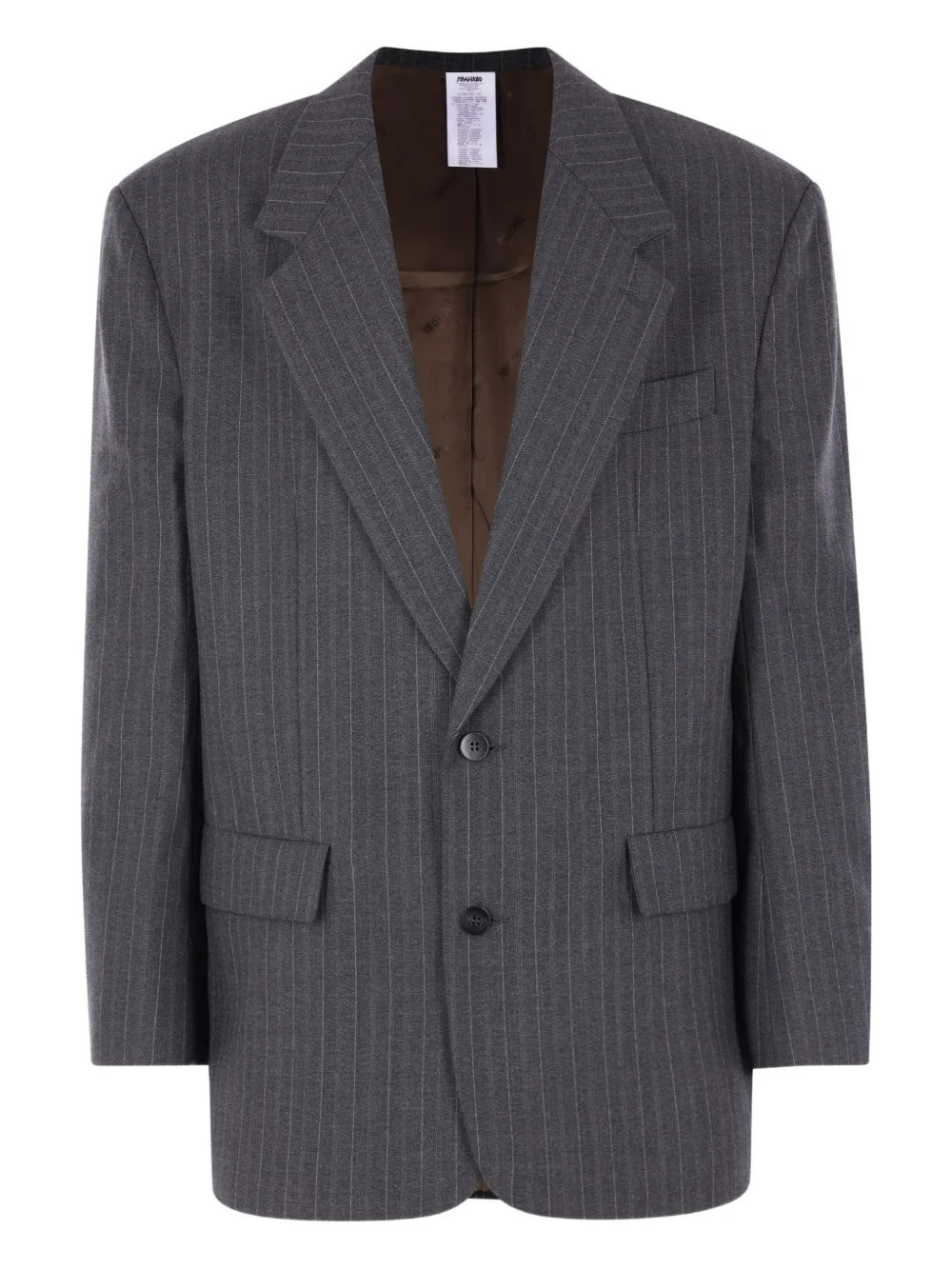 pinstriped button-up blazer Highlights - Grey - Pinstripe - Button fastening - Side flap pockets - Notched lapels - Buttoned cuffs Made in Italy Composition Virgin Wool 92%, Polyamide 7%, Polyester 1% Washing instructions Read Manufacturer Guidelines