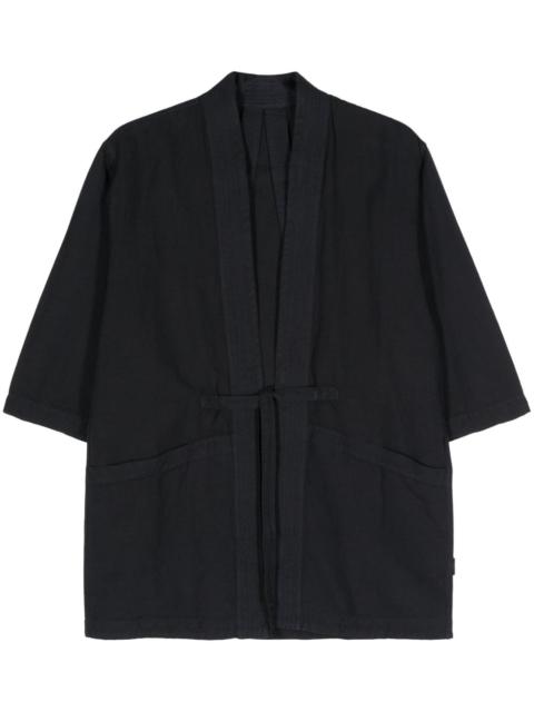 5088 organic cotton-blend jacket Highlights - Navy blue - Organic cotton blend - Garment dyed - Tonal stitching - Collarless - Half-length sleeves - Two front patch pockets - Strap detailing - Front tie fastening Imported Composition Hemp 50%, Organic Cotton 50%