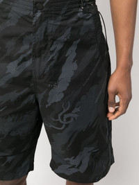 camouflage-print shorts Highlights - Smoky black - Organic cotton blend - Camouflage pattern - Pleat detailing - High-waisted - Wide leg - Elasticated drawstring waistband - Front button fastening - Internal slip pocket - Side zip-fastening pocket Imported Composition Organic Cotton 66%, Recycled Polyester 34% SIZE & FIT Model measurements Height 6 ft 1 in(1.85 m) Bust/Chest 38.58 in(98 cm) Hips 37 in(94 cm) Waist 30.31 in(77 cm) FittingInformation Designed for a straight-leg fit, offering an unrestricted and comfortable fit over the leg Adjust this piece’s waistband to your preference using the drawstring Made from a midweight non-stretch fabric This piece fits true to size – take your usual size