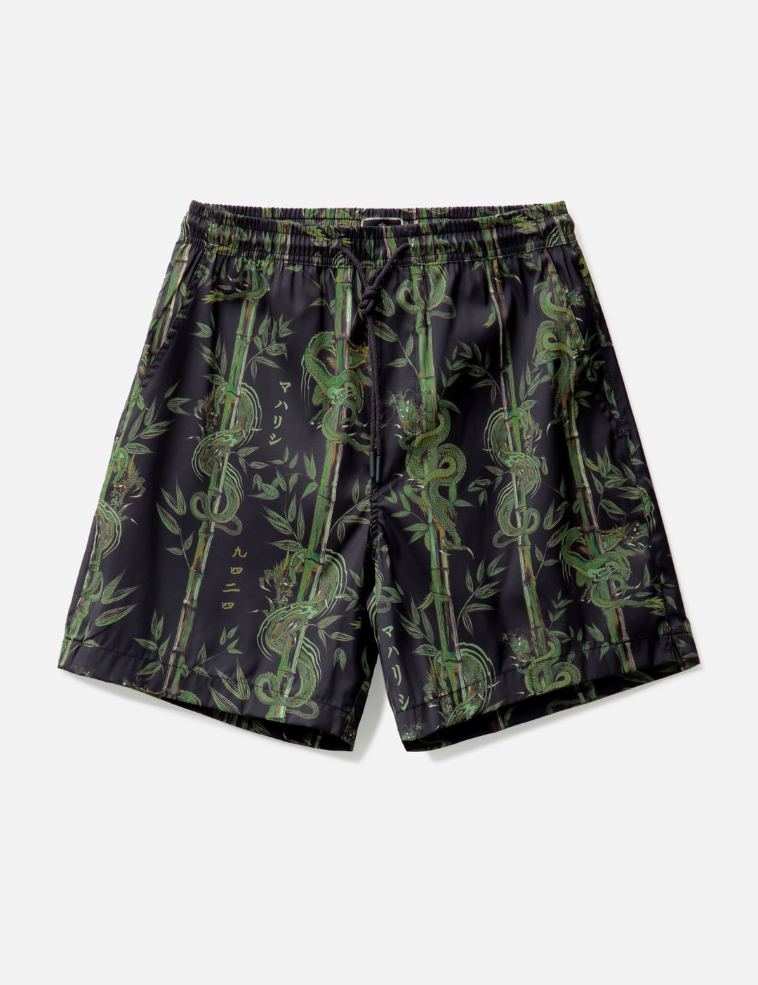 - Maharishi - Dragon Bamboo Swim Shorts - Newlife™ Recycled Polyester - Dragon Bamboo Print - Drawcord waist - Secure flap pocket - Includes pack bag - Mesh lining - Made in Portugal - Color: Black - Material: 100% Recycled Polyester - See more Shorts and Clothing SIZING - Model wears size 3 - Model measures: Height 187cm, Chest 36”/91cm, Waist 28”/72cm, Hip 36”/91cm