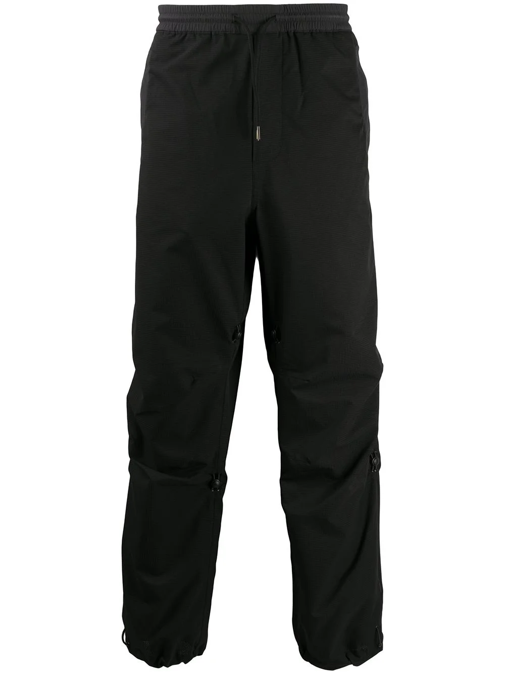 drawstring track pants Black drawstring track pants from Maharishi featuring an elasticated drawstring waist, side pockets, a back pocket and a regular length. Imported Composition Polyester 100% SIZE & FIT Model measurements Height 6 ft 2 in(1.89 m) Bust/Chest 36.22 in(92 cm) Hips 37.79 in(96 cm) Waist 29.52 in(75 cm) FittingInformation This piece fits true to size. We recommend you get your regular size Designed for a slim fit at the waist and loose over the leg Made with a mid-weight fabric Washing instructions Machine Wash