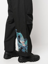 graphic-print trousers Highlights - Black - Organic cotton-recycled polyester blend - Graphic print to the rear - Elasticated waistband - Front button and zip fastening - Straight leg - Two side inset pockets Imported Composition Organic Cotton 66%, Recycled Polyester 34% SIZE & FIT Model measurements Height 6 ft 2 in(1.87 m) Bust/Chest 36.41 in(92.5 cm) Hips 37 in(94 cm) Waist 29.52 in(75 cm) FittingInformation Designed for a relaxed straight leg, allowing a comfortable and loose fit over the leg The elasticated waist allows for a comfortable fit Made from a midweight non-stretch fabric This piece fits true to size – take your usual size