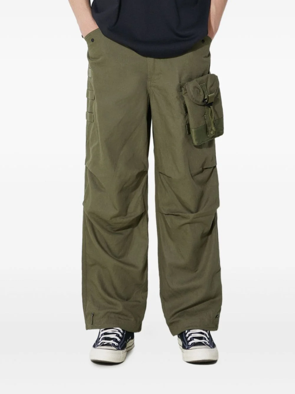 M.A.L.I.C.E. M51 cargo trousers Highlights - Olive green - Textured finish - Front button and zip fastening - Belt loops - Adjustable waist strap - Two side flap pockets - Detachable front pocket - Two rear flap pockets - Straight leg Imported Composition Organic Cotton 63%, Hemp 37% Washing instructions Read Manufacturer Guidelines