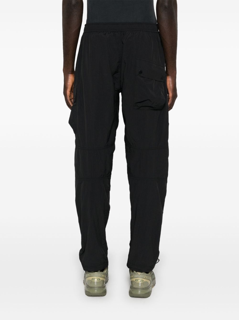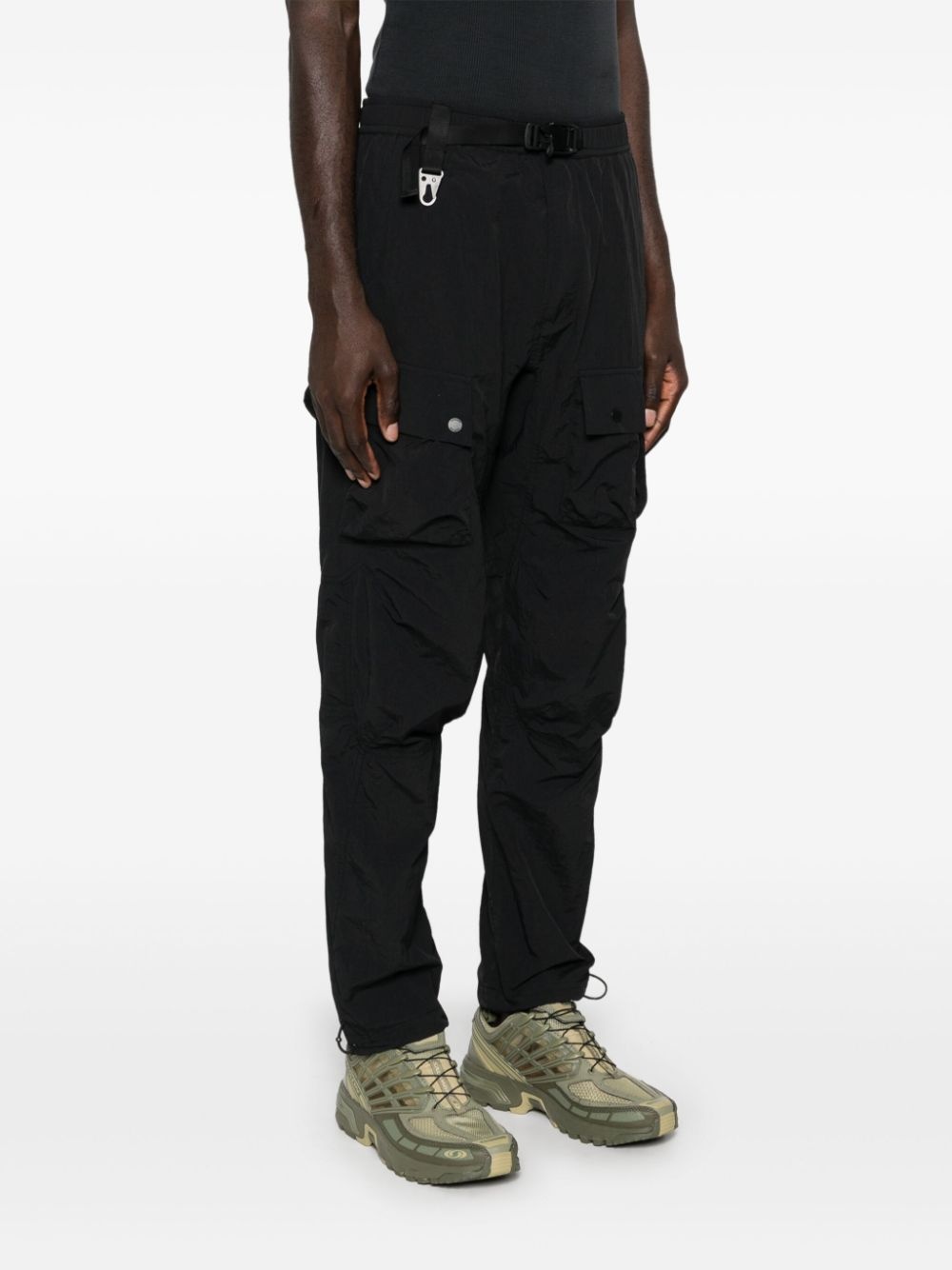 multi-pocket cargo pants Highlights - Black - Recycled nylon - Multiple cargo pockets - Concealed front zip fly fastening - Elasticated waistband - Front buckle fastening to the waist - Two side slash pockets - Drawstring hem - Full-length - Tapered leg Imported Composition Recycled Nylon 100% SIZE & FIT Model measurements Height 6 ft 1 in(1.86 m) Bust/Chest 35.82 in(91 cm) Hips 36.22 in(92 cm) Waist 28.74 in(73 cm) FittingInformation Designed for a relaxed tapered leg, allowing a comfortable loose fit above the knee with a closer fit towards the calves The elasticated waist allows for a comfortable fit Made from a lightweight non-stretch fabric