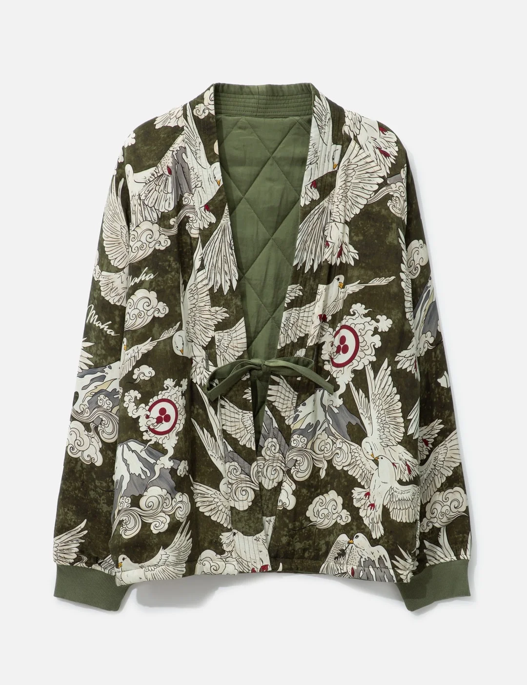 - Maharishi - Peace Dove Reversible Kimono - Made of 120gsm Italian cupro twill - Reversible design - Allover Pax Cultura Doves Print - Reverses to plain color quilted side - Waist strap - Ribbed cuffs - Color: Olive - Material: 100% Italian Cupro Twill - See more Jackets and Clothing SIZING - Model wears size M - Model measures: Height 183cm, Chest 35.5"/90cm, Waist 30"/76cm, Hip 33"/84cm