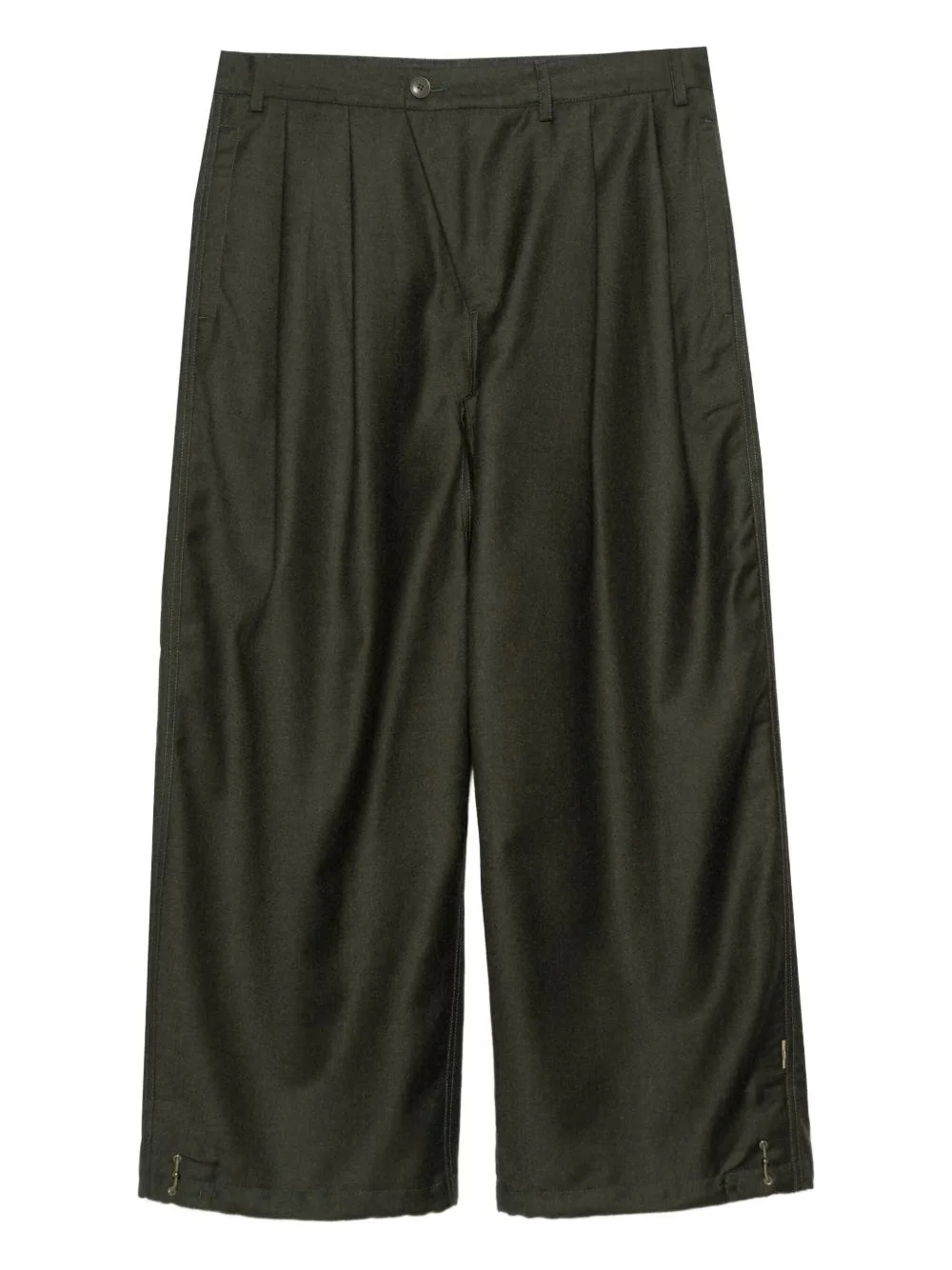 EXPERTLY TAILORED DARK GREEN WIDE-LEG TROUSERS FEATURING ELEGANT PLEATED FRONT DETAILING FOR A SOPHISTICATED SILHOUETTE. FUNCTIONAL SIDE SLIT POCKETS ENHANCE PRACTICALITY WHILE MAINTAINING CLEAN LINES, COMPLEMENTED BY A REFINED BACK JETTED POCKET. THE PERFECT BALANCE OF PROFESSIONAL STYLE AND CONTEMPORARY DESIGN.