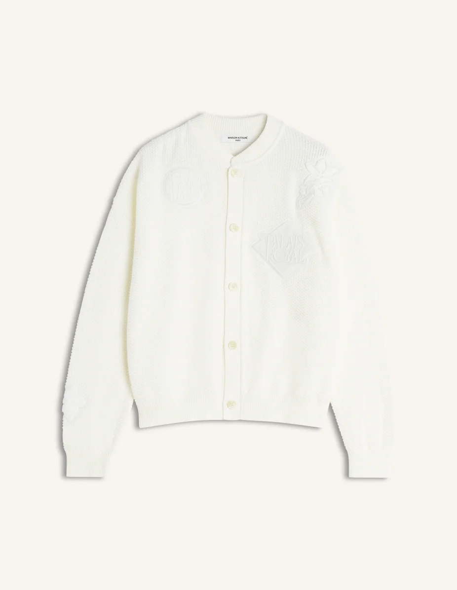 DETAILS Knitted blouson in embroidered cotton. Comfort fit with Art Nouveau Stamps patch and direct embroideries. - Knitted blouson in cotton - Comfort fit - Crew neck - Maison Kitsune engraved button closure - Art Nouveau Stamps motif embroidered on the front - Ribbing at the neckline, cuffs, and bottom QM02153KT1199-0383 SIZE & CUT Cut: COMFORT Sizing: MEN The male model is 6.1 tall and wears a size S MATERIAL 70% COTTON, 30% POLYAMIDE TRACEABILITY Made in China