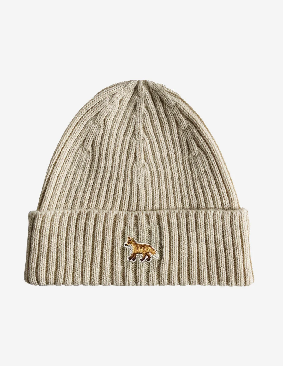 DETAILS Cotton beanie with Baby Fox embroidered patch on the cuff. - Plain cotton knit beanie - Baby Fox embroidered patch on the cuff PW06103KT1140-P700 SIZE & CUT Sizing: UNISEX MATERIAL 100% COTTON TRACEABILITY Made in Morocco