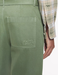 DETAILS Cargo pants in overdyed denim. Relaxed cut with Maison Kitsune Handwriting signature embroidered and Profile Fox embossed jacron. - Overdyed denim cargo pants - Relaxed cut - Waistband with belt loops - Removable belt with buckle and metal eyelets - Engraved metal button closure with hidden placket - Two side slash pockets - Two side patch pockets - Profile Fox embossed leather jacron at the back - Two patch pockets at the back - Tone-on-tone Maison Kitsune Handwriting signature embroidered on the back pocket OM01104WD4012-0077 SIZE & CUT Cut: RELAXED Sizing: MEN The male model is 9.5 and is wearing size M MATERIAL Main Material: 100% COTTON, Pocket lining: 100% COTTON TRACEABILITY Made in Tunisia