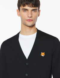 DETAILS Extra-fine merino wool V-neck cardigan. Regular fit with embroidered Fox Head patch. - Extra-fine merino wool cardigan - Regular fit - V neck - Long sleeves - Maison Kitsune engraved button closure - Ribbing at the neckline, cuffs and waist - Fine gauge knit - Fox Head embroidered patch on the chest PM00501KT1181-P199 SIZE & CUT Cut: REGULAR Sizing: MEN The male model is 6.1 and is wearing size M MATERIAL 100% WOOL TRACEABILITY Made in Morocco