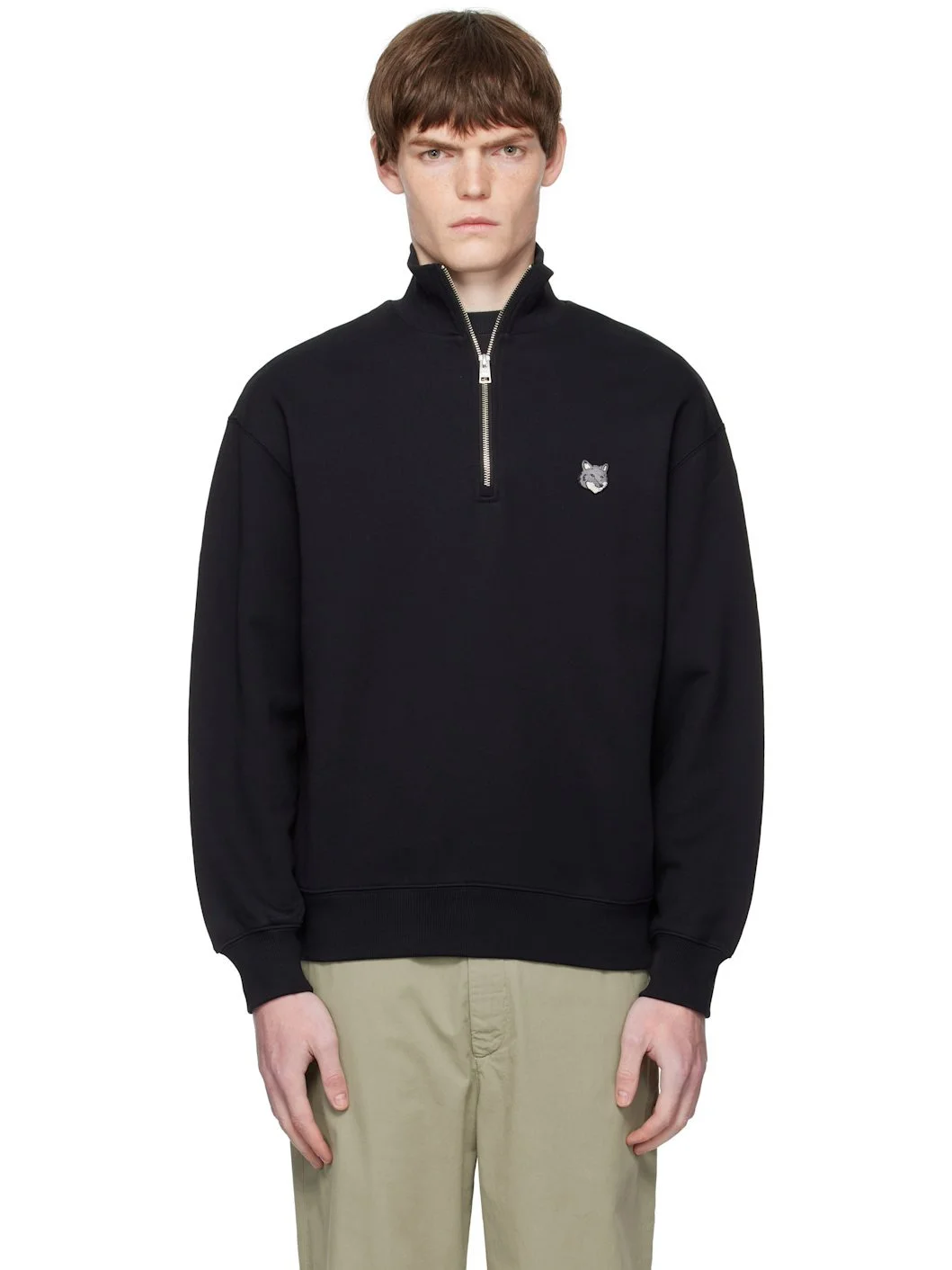 Cotton French terry sweatshirt. · Rib-knit stand collar, cuffs, and hem · Half-zip closure · Logo patch embroidered at chest Supplier color: Black Body: 100% cotton. Trim: 98% cotton, 2% elastane. Made in Portugal 252389M202008