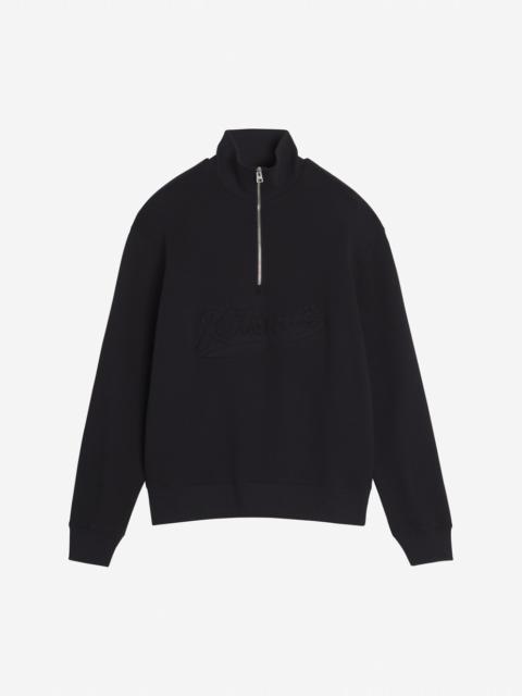 DETAILS Fleece varsity sweatshirt with half zip collar. Comfort fit with embossed “Kitsune” Varsity logo on the front. - Sweatshirt in plain fleece - Comfort fit - Half zip collar - Embossed “Kitsune” Varsity logo on the front - Long sleeves - Ribbing at the collar, cuffs, and waistband - Plain back OM00302KM0321-P199 SIZE & CUT Sizing: MEN MATERIAL Main Material: 100% COTTON, RIB: 98% COTTON, 2% ELASTANE TRACEABILITY Made in Portugal