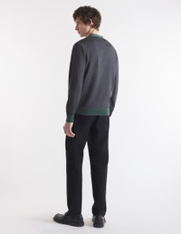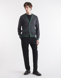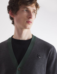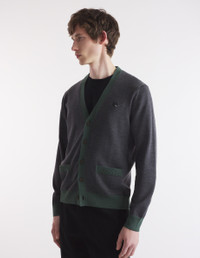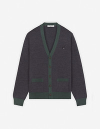 DETAILS Long sleeve bicolor merino wool cardigan. Regular fit with Bold Fox Head patch embroidered on the chest. - Bicolor merino wool cardigan - Regular fit - V-neck - Closure with engraved horn buttons - Long sleeves - Two patch front pockets - Contrast ribbing at the neckline, cuffs, pockets, and waist - Embroidered Bold Fox Head patch on the chest NM00507KT1036-H170 SIZE & CUT Cut: REGULAR Sizing: MEN The female model is 5.7 and is wearing size S MATERIAL 100% WOOL TRACEABILITY Made in Morocco