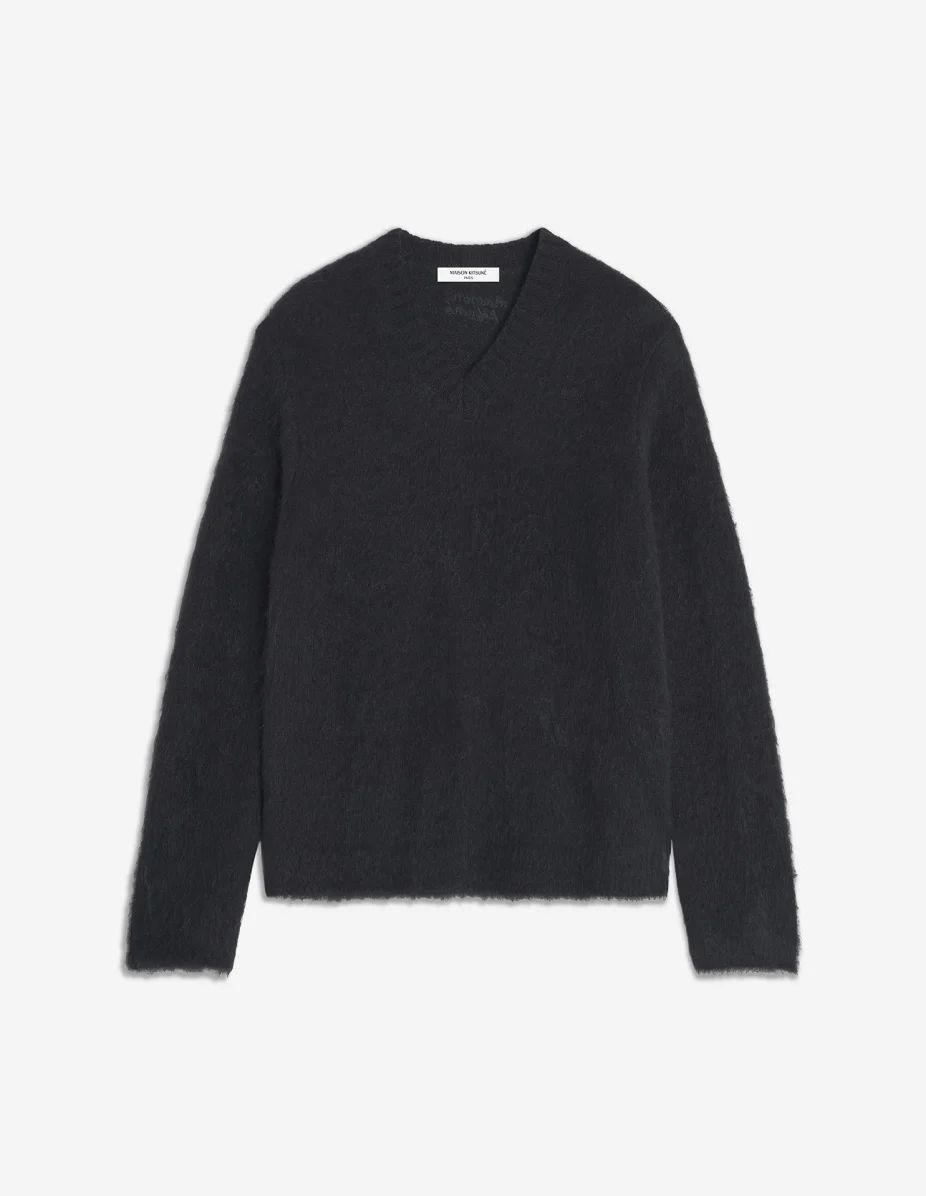 DETAILS Brushed mohair jumper with long sleeves. Comfort fit with Maison Kitsune Handwriting embroidered signature. - Wool and brushed mohair blend sweater for a soft handfeel - Comfort fit - V neck - Long sleeves - Rib finishing at the neckline, cuffs and hem - Tonal Maison Kitsune Handwriting signature embroidered at the back PM00805KT1162-P199 SIZE & CUT Cut: COMFORT Sizing: MEN The male model is 6.1 and is wearing size M MATERIAL 21% POLYAMIDE, 30% MOHAIR WOOL, 49% WOOL TRACEABILITY Made in China