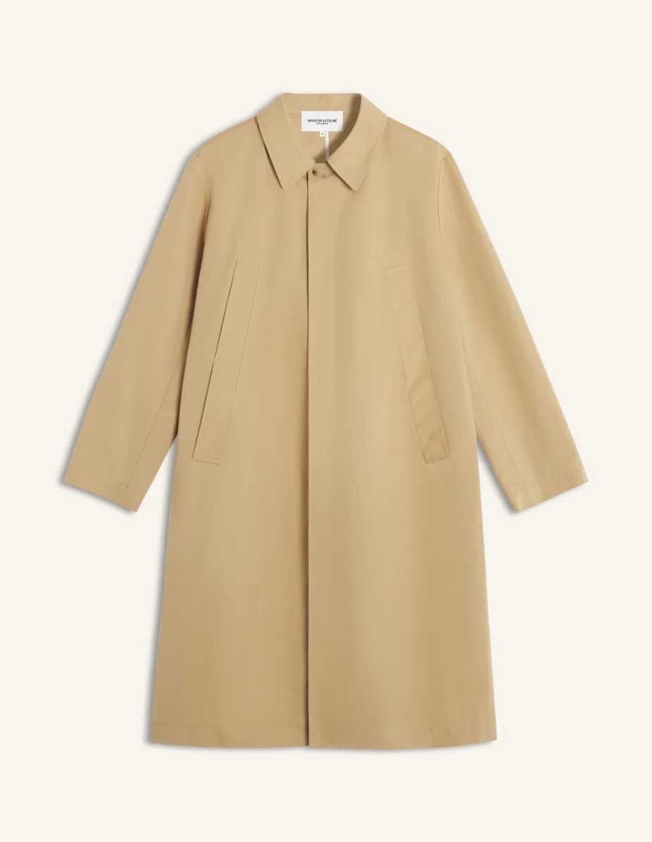 DETAILS Car coat in Cordura cotton canvas. Relaxed fit with Maison Kitsune Paris engraved metal rivet at the back neckline. - Car coat in water repellent cordura cotton canvas - Minimal design with refined lines - Relaxed fit - Shirt collar - Hidden button closure - Two front slant pockets with large welted details - Back slit for ease - Maison Kitsune Paris engraved metal rivet at the back neckline QM02205WQ4084-0158 SIZE & CUT Cut: RELAXED Sizing: MEN MATERIAL Main Material: 73% COTTON, 27% POLYAMIDE, Pocket lining: 50% COTTON, 50% MODAL TRACEABILITY Made in Bulgaria