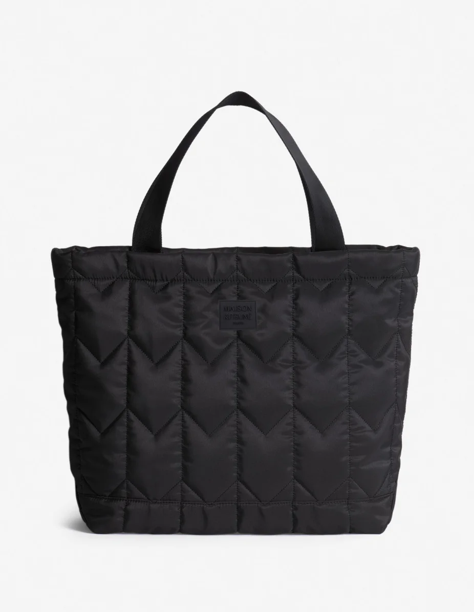 DETAILS Large Chevron Fox quilted tote bag in soft nylon. - Large Chevron Fox quilted nylon tote bag - Two generous webbing handles for hand or shoulder carry - Contrasted Maison Kitsune Paris silicone patch at front - Main zipped compartment with Profile fox-engraved zip puller - Inside patch pocket - Twill lining - Dimensions: 48.5 x 36 x 14 cm PM05104WB0043-P199 SIZE & CUT Sizing: UNISEX MATERIAL 100% POLYESTER TRACEABILITY Made in China