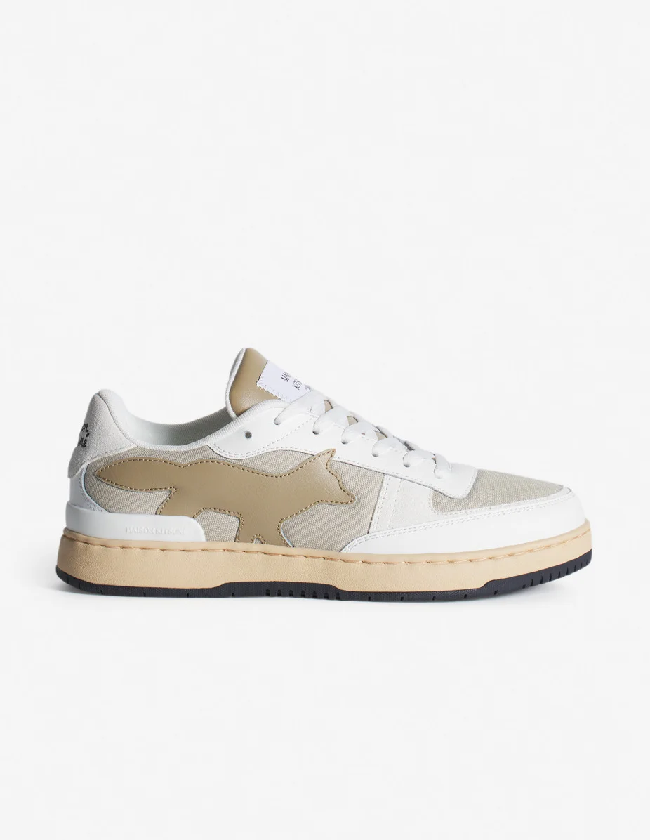 DETAILS Chiru Trainers in canvas, smooth leather and suede. Profile fox on the side and embossed Maison Kitsune Handwriting signature. - Chiru Trainers in smooth and suede leather and canvas - Tonal leather Profile Fox topstitched on the sides - Embossed Maison Kitsune Handwriting signature at the back - Woven Maison Kitsune Paris label on the tongue - Molded rubber outsole with signature Profile Fox - Lace-up closure MM04804OF0004-0365 SIZE & CUT Sizing: MEN The female model is 5.7 and is wearing size 40 MATERIAL Lining: 40% VINYL ETHYLENE ACETATE, 50% POLYESTER, 10% POLYURETHANE, Upper: 55% BOVINE LEATHER, 40% COTTON, 5% CALF LEATHER, Outsole: 98% RUBBER, 2% THERMOPLASTIC POLYURETHANE, Insole: 40% VINYL ETHYLENE ACETATE, 50% POLYESTER, 10% POLYURETHANE TRACEABILITY Made in China